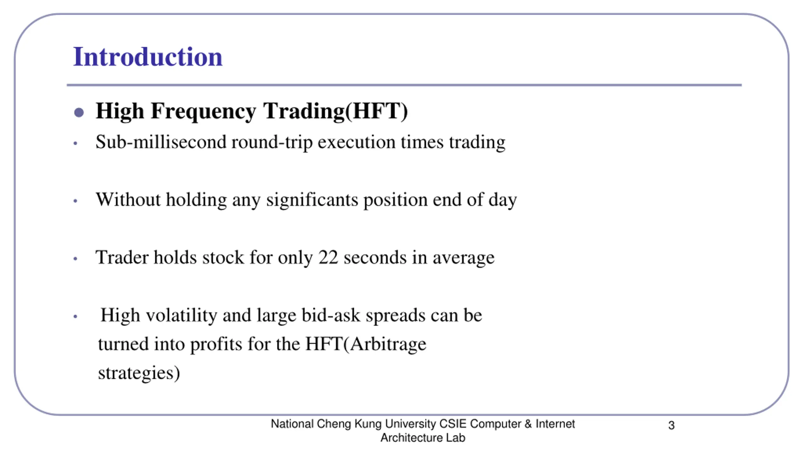 Introduction High Frequency Trading(HFT) Sub-millisecond round-trip execution times trading Without holding any significants position end of day Trader holds stock for only 22 seconds in average High volatility and large bid-ask spreads can be turned into profits for the HFT(Arbitrage strategies) National Cheng Kung University CSIE Computer & Internet Architecture Lab 3