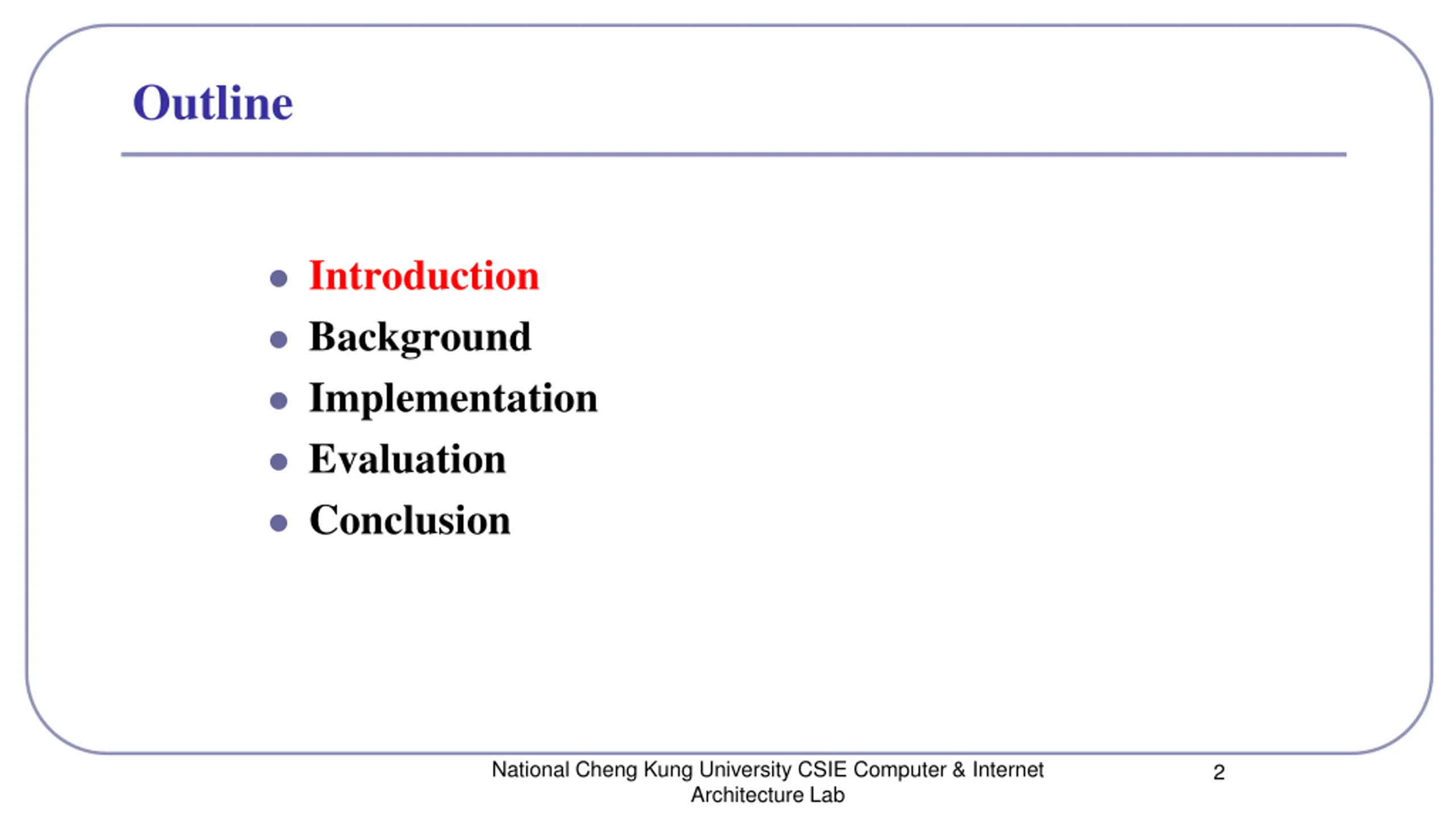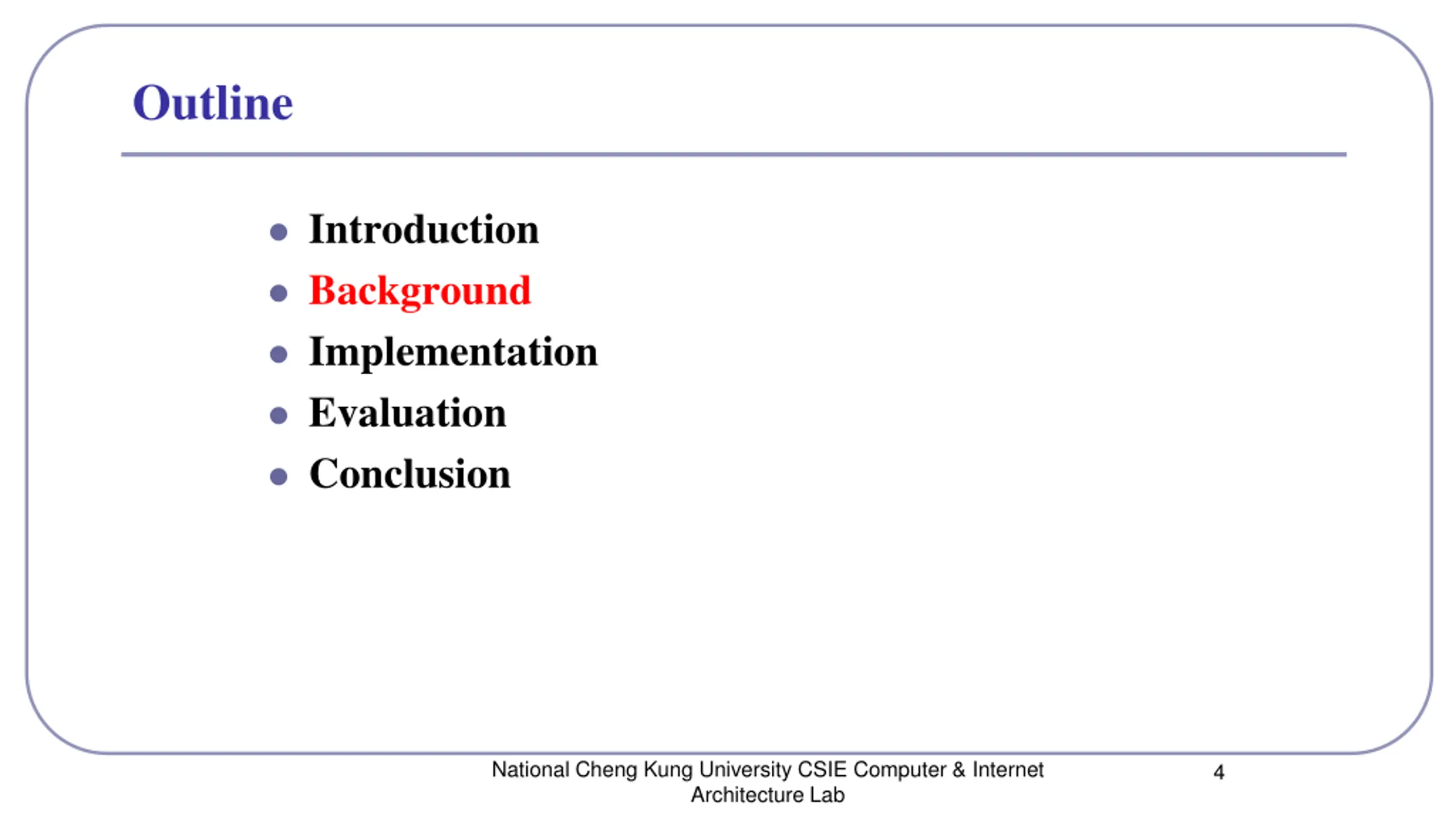 Outline Introduction Background Implementation Evaluation Conclusion National Cheng Kung University CSIE Computer & Internet Architecture Lab 2