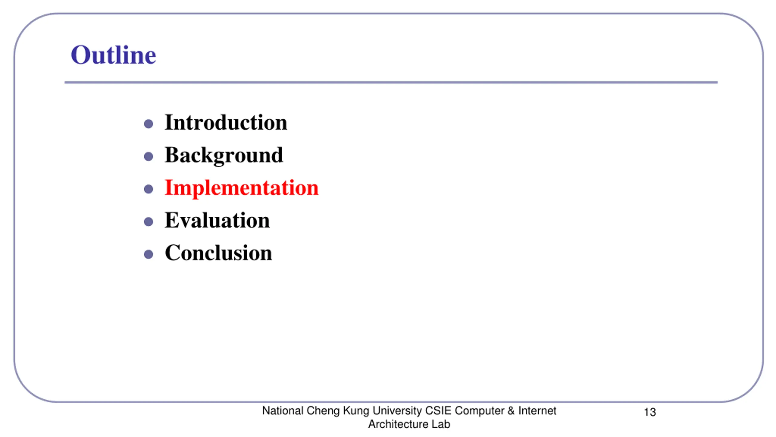 Outline Introduction Background Implementation Evaluation Conclusion National Cheng Kung University CSIE Computer & Internet Architecture Lab 13