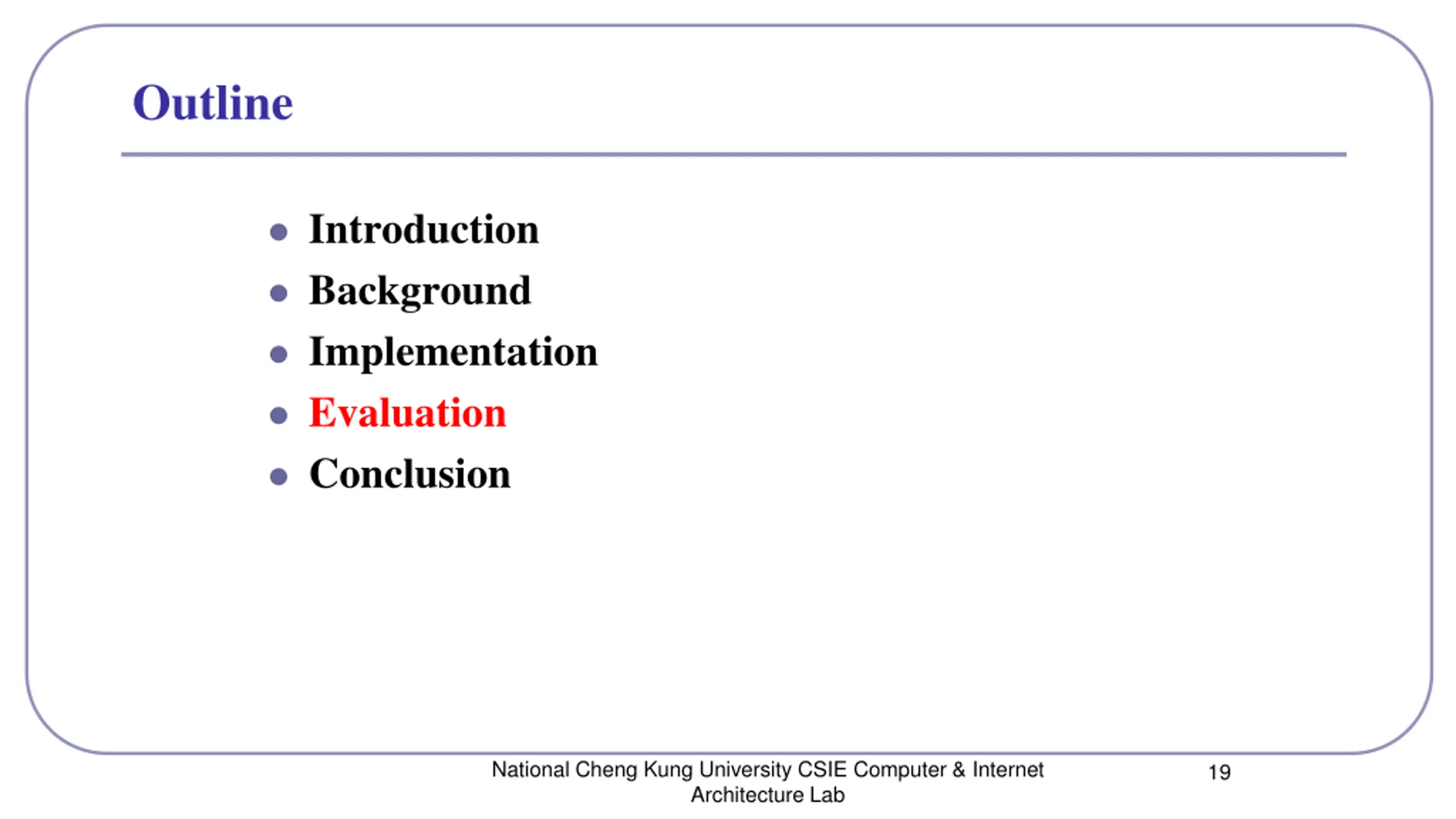 Outline Introduction Background Implementation Evaluation Conclusion National Cheng Kung University CSIE Computer & Internet Architecture Lab 19