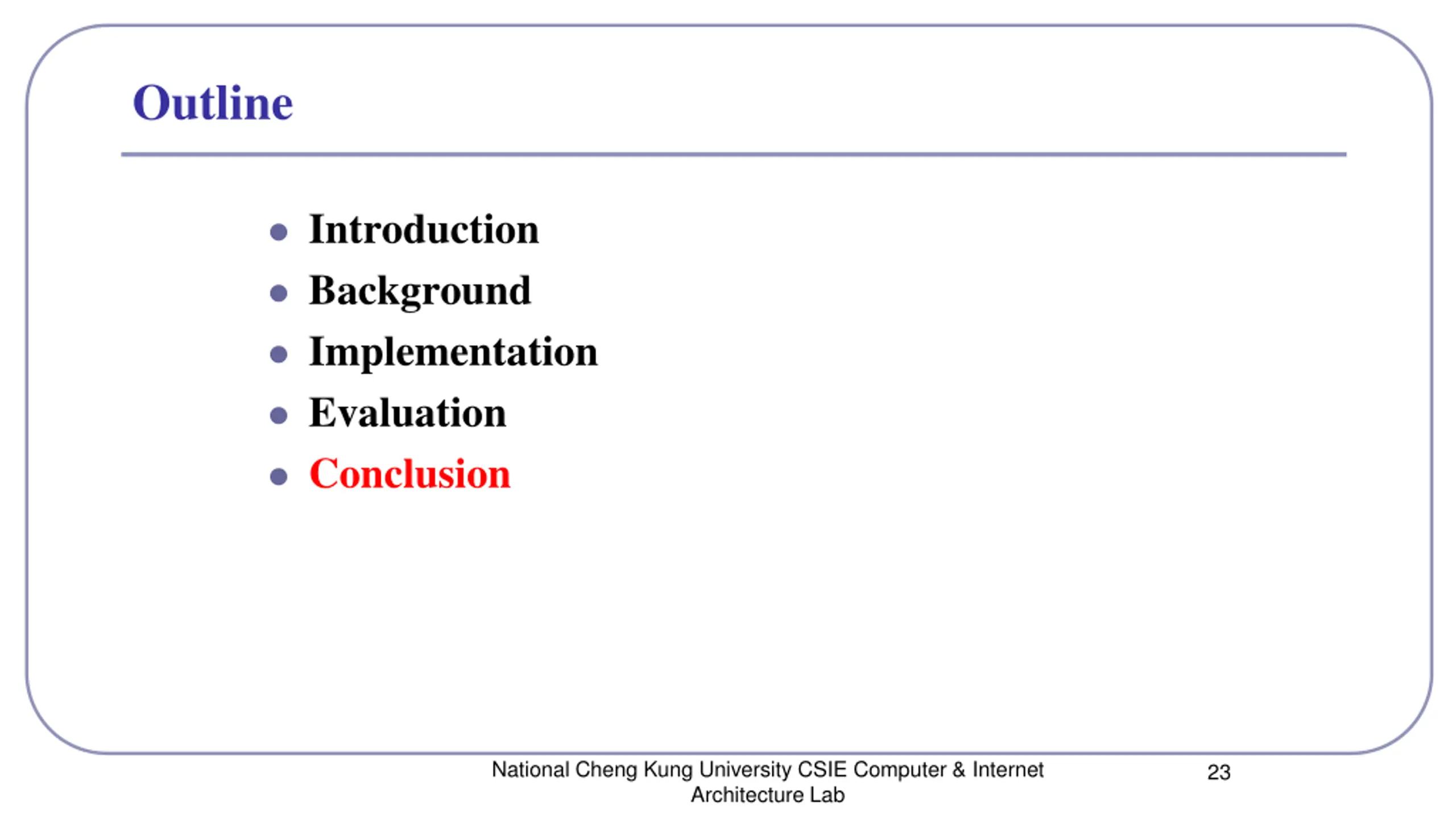 Outline Introduction Background Implementation Evaluation Conclusion National Cheng Kung University CSIE Computer & Internet Architecture Lab 23