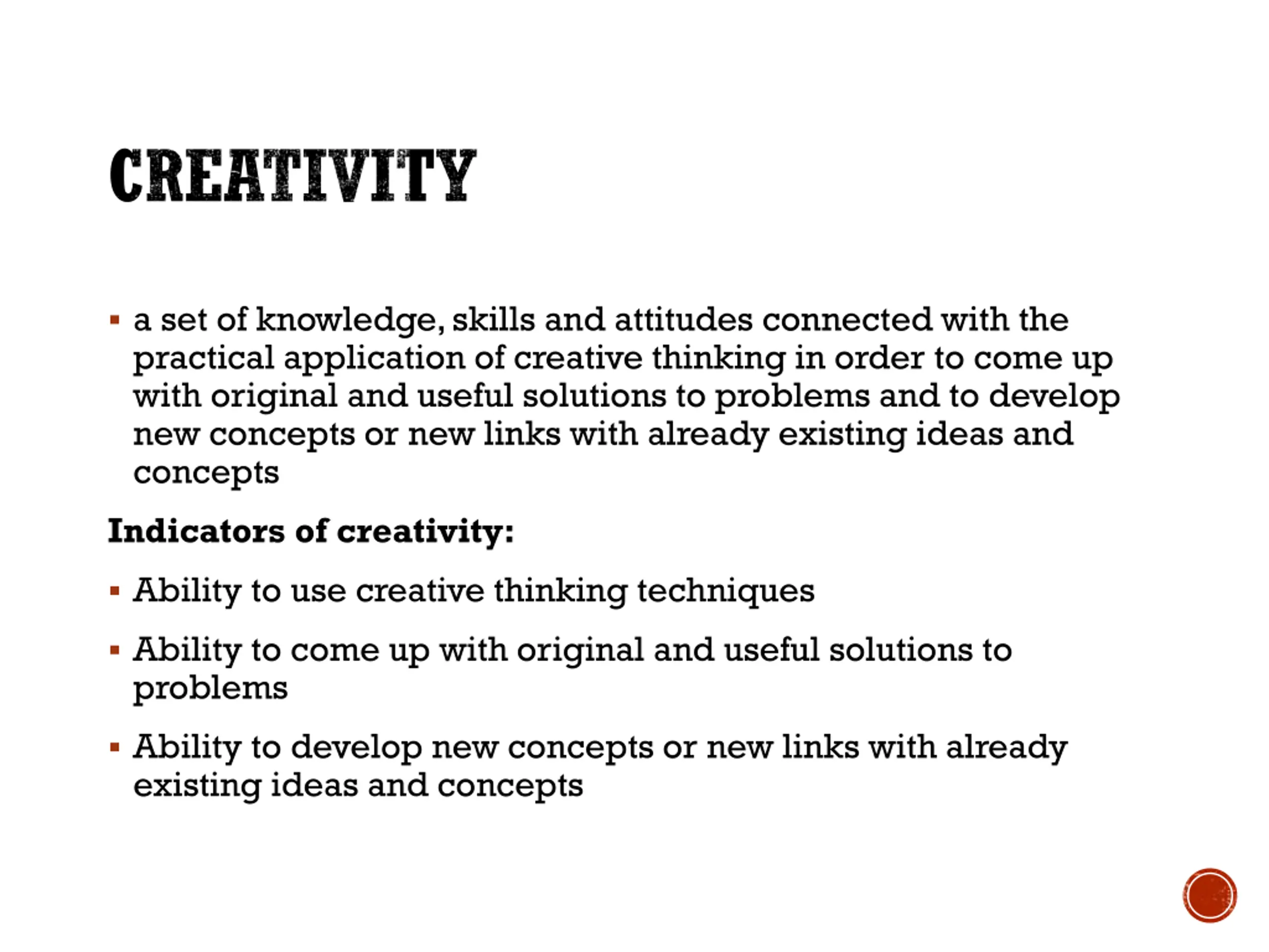 - CREATIVITY a set of knowledge, skills and attitudes connected with the practical application of creative thinking in order to come up with original and useful solutions to problems and to develop new concepts or new links with already existing ideas and concepts Indicators of creativity: Ability to use creative thinking techniques Ability to come up with original and useful solutions to problems Ability to develop new concepts or new links with already existing ideas and concepts
