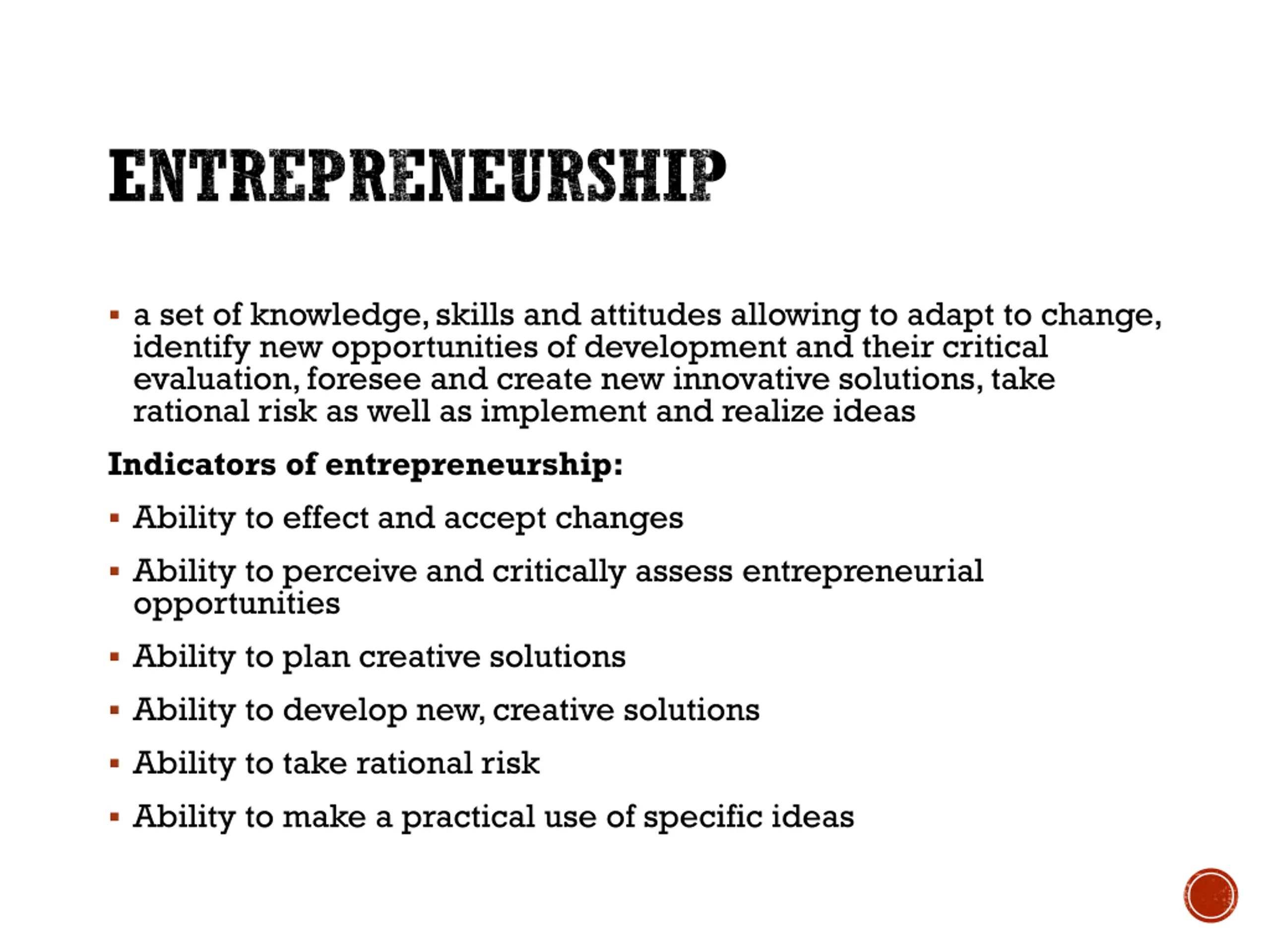- ENTREPRENEURSHIP a set of knowledge, skills and attitudes allowing to adapt to change, identify new opportunities of development and their critical evaluation, foresee and create new innovative solutions, take rational risk as well as implement and realize ideas Indicators of entrepreneurship: Ability to effect and accept changes Ability to perceive and critically assess entrepreneurial opportunities Ability to plan creative solutions Ability to develop new, creative solutions Ability to take rational risk Ability to make a practical use of specific ideas