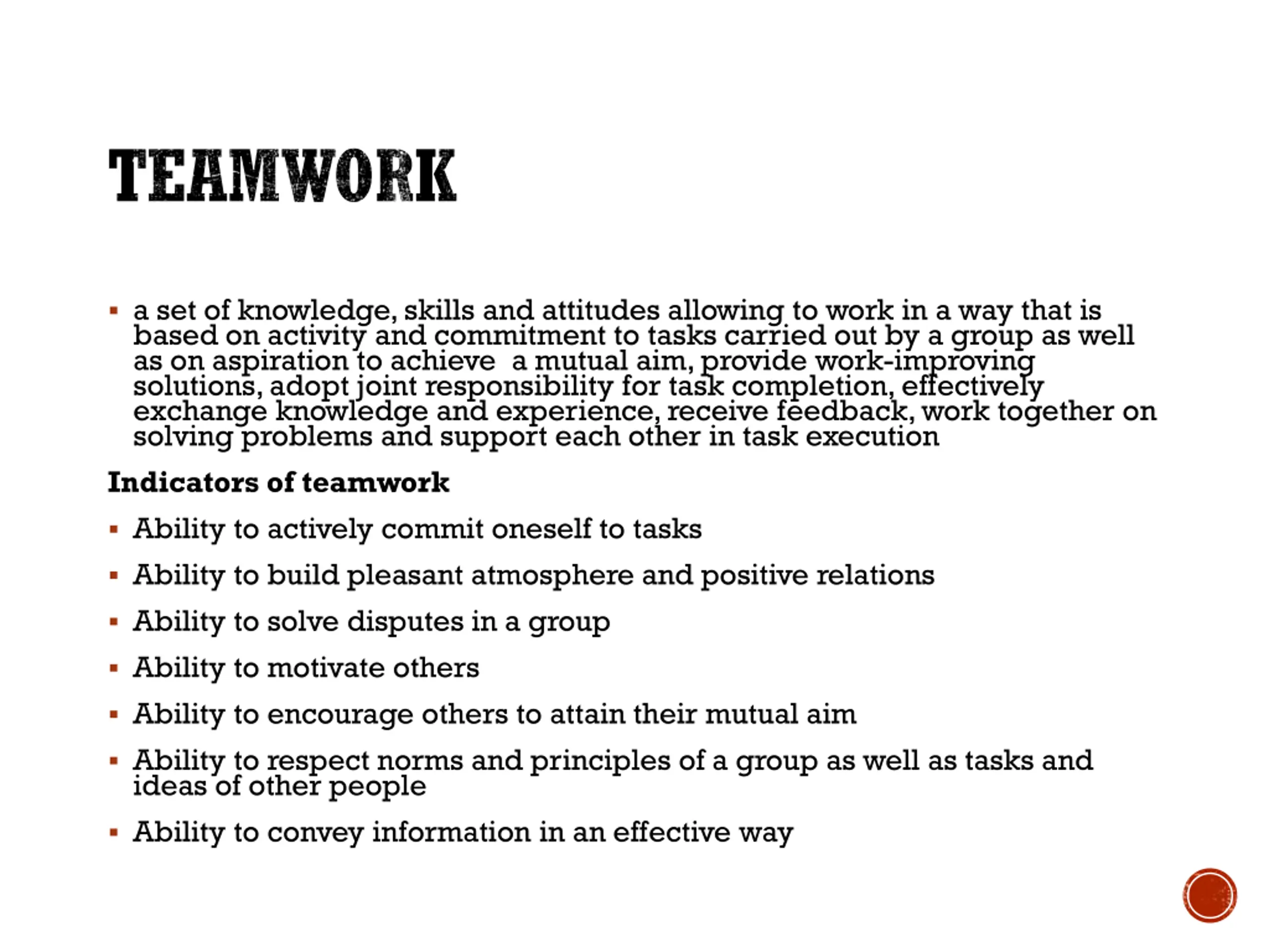 - TEAMWORK a set of knowledge, skills and attitudes allowing to work in a way that is based on activity and commitment to tasks carried out by a group as well as on aspiration to achieve a mutual aim, provide work-improving solutions, adopt joint responsibility for task completion, effectively exchange knowledge and experience, receive feedback, work together on solving problems and support each other in task execution Indicators of teamwork Ability to actively commit oneself to tasks Ability to build pleasant atmosphere and positive relations Ability to solve disputes in a group Ability to motivate others Ability to encourage others to attain their mutual aim Ability to respect norms and principles of a group as well as tasks and ideas of other people Ability to convey information in an effective way