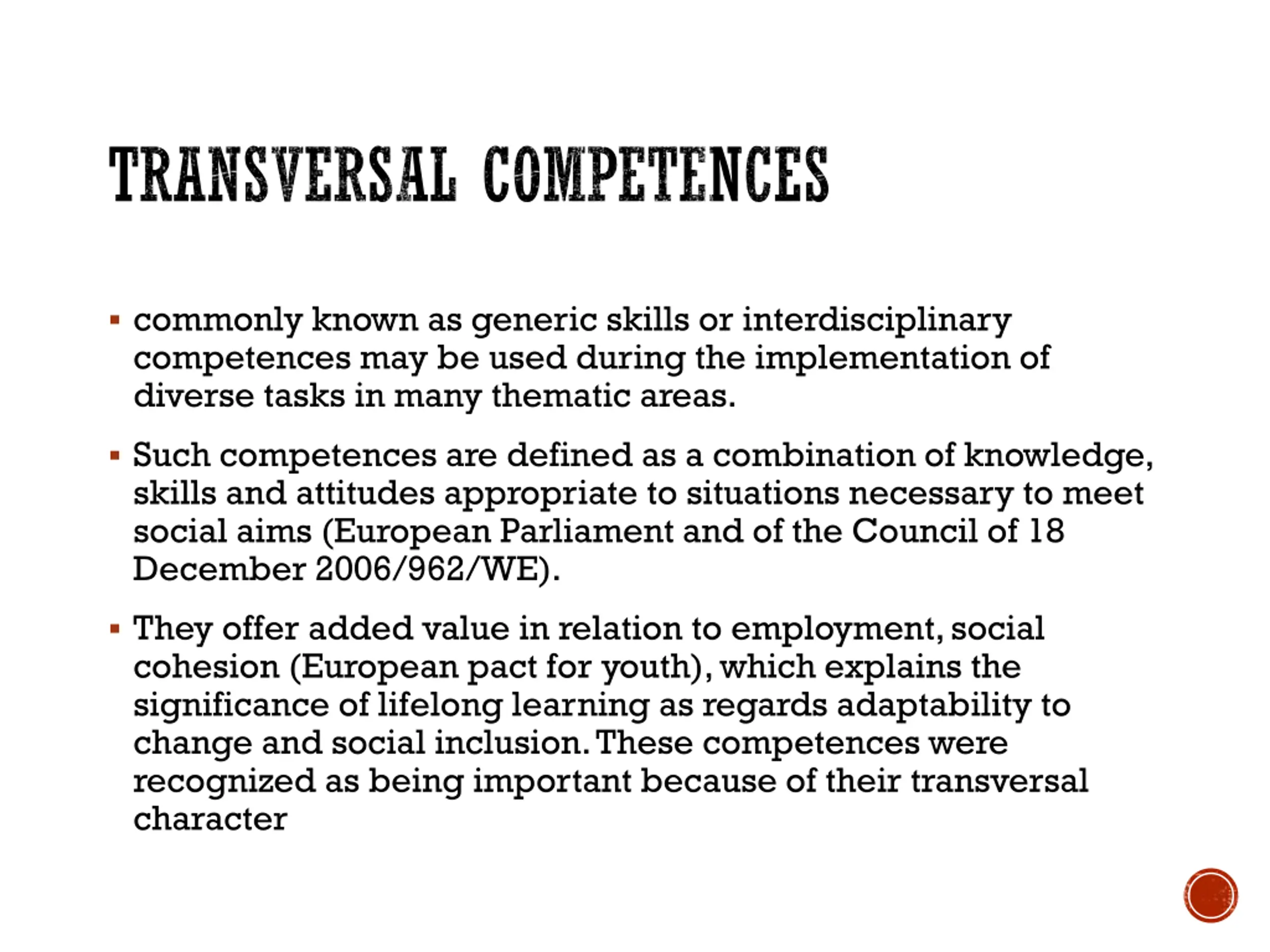 - TRANSVERSAL COMPETENCES commonly known as generic skills or interdisciplinary competences may be used during the implementation of diverse tasks in many thematic areas. Such competences are defined as a combination of knowledge, skills and attitudes appropriate to situations necessary to meet social aims (European Parliament and of the Council of 18 December 2006/962/WE). They offer added value in relation to employment, social cohesion (European pact for youth), which explains the significance of lifelong learning as regards adaptability to change and social inclusion. These competences were recognized as being important because of their transversal character
