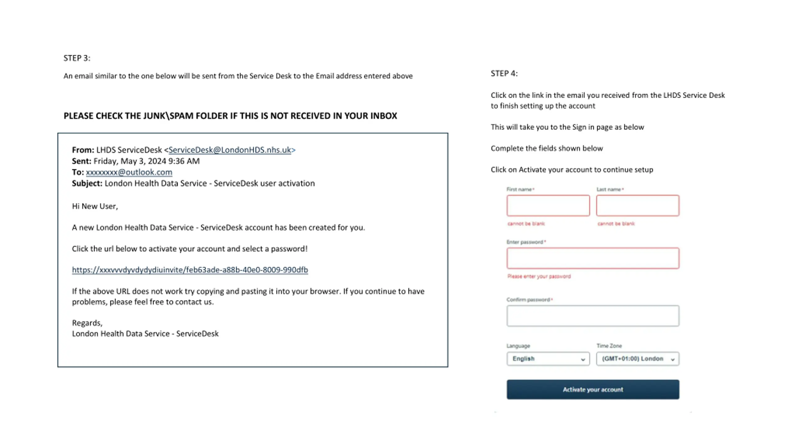 STEP 3: STEP 4: An email similar to the one below will be sent from the Service Desk to the Email address entered above Click on the link in the email you received from the LHDS Service Desk to finish setting up the account PLEASE CHECK THE JUNK\SPAM FOLDER IF THIS IS NOT RECEIVED IN YOUR INBOX This will take you to the Sign in page as below Complete the fields shown below Click on Activate your account to continue setup From: LHDS ServiceDesk <ServiceDesk@LondonHDS.nhs.uk> Sent: Friday, May 3, 2024 9:36 AM To: xxxxxxxx@outlook.com Subject: London Health Data Service - ServiceDesk user activation Hi New User, A new London Health Data Service - ServiceDesk account has been created for you. Click the url below to activate your account and select a password! https://xxxvvvdyvdydydiuinvite/feb63ade-a88b-40e0-8009-990dfb If the above URL does not work try copying and pasting it into your browser. If you continue to have problems, please feel free to contact us. Regards, London Health Data Service - ServiceDesk
