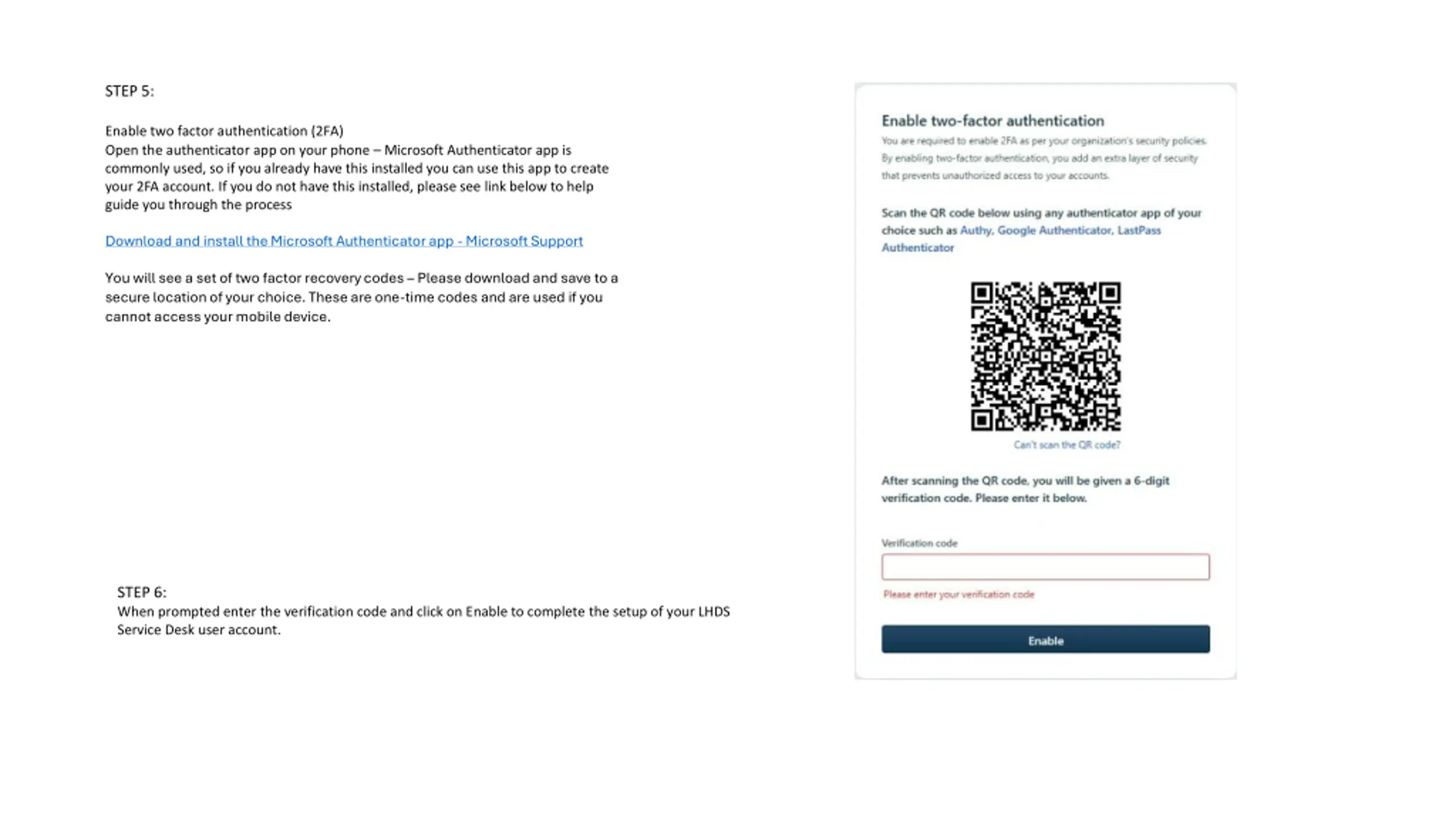 STEP 5: Enable two factor authentication (2FA) Open the authenticator app on your phone Microsoft Authenticator app is commonly used, so if you already have this installed you can use this app to create your 2FA account. If you do not have this installed, please see link below to help guide you through the process Download and install the Microsoft Authenticator app - Microsoft Support You will see a set of two factor recovery codes Please download and save to a secure location of your choice. These are one-time codes and are used if you cannot access your mobile device. STEP 6: When prompted enter the verification code and click on Enable to complete the setup of your LHDS Service Desk user account.