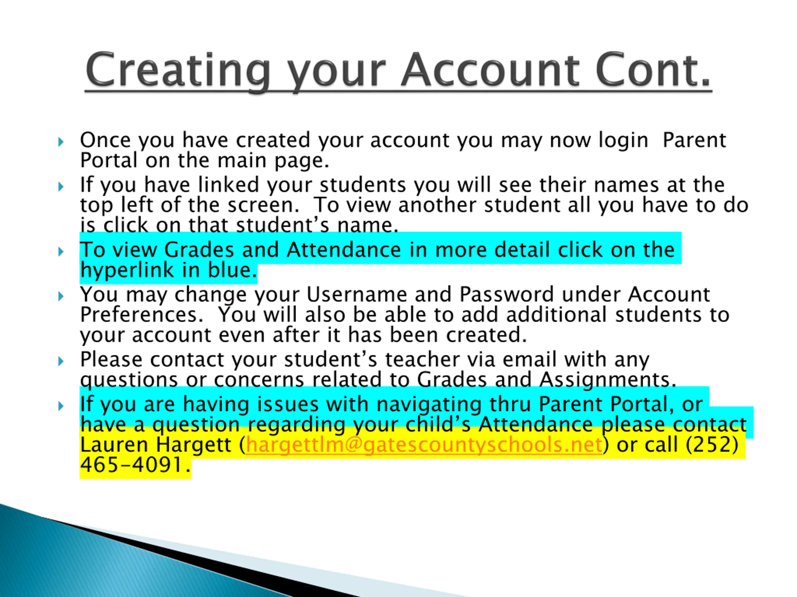 Once you have created your account you may now login Parent Portal on the main page. If you have linked your students you will see their names at the top left of the screen. To view another student all you have to do is click on that student s name. To view Grades and Attendance in more detail click on the hyperlink in blue. You may change your Username and Password under Account Preferences. You will also be able to add additional students to your account even after it has been created. Please contact your student s teacher via email with any questions or concerns related to Grades and Assignments. If you are having issues with navigating thru Parent Portal, or have a question regarding your child s Attendance please contact Lauren Hargett (hargettlm@gatescountyschools.net) or call (252) 465-4091.