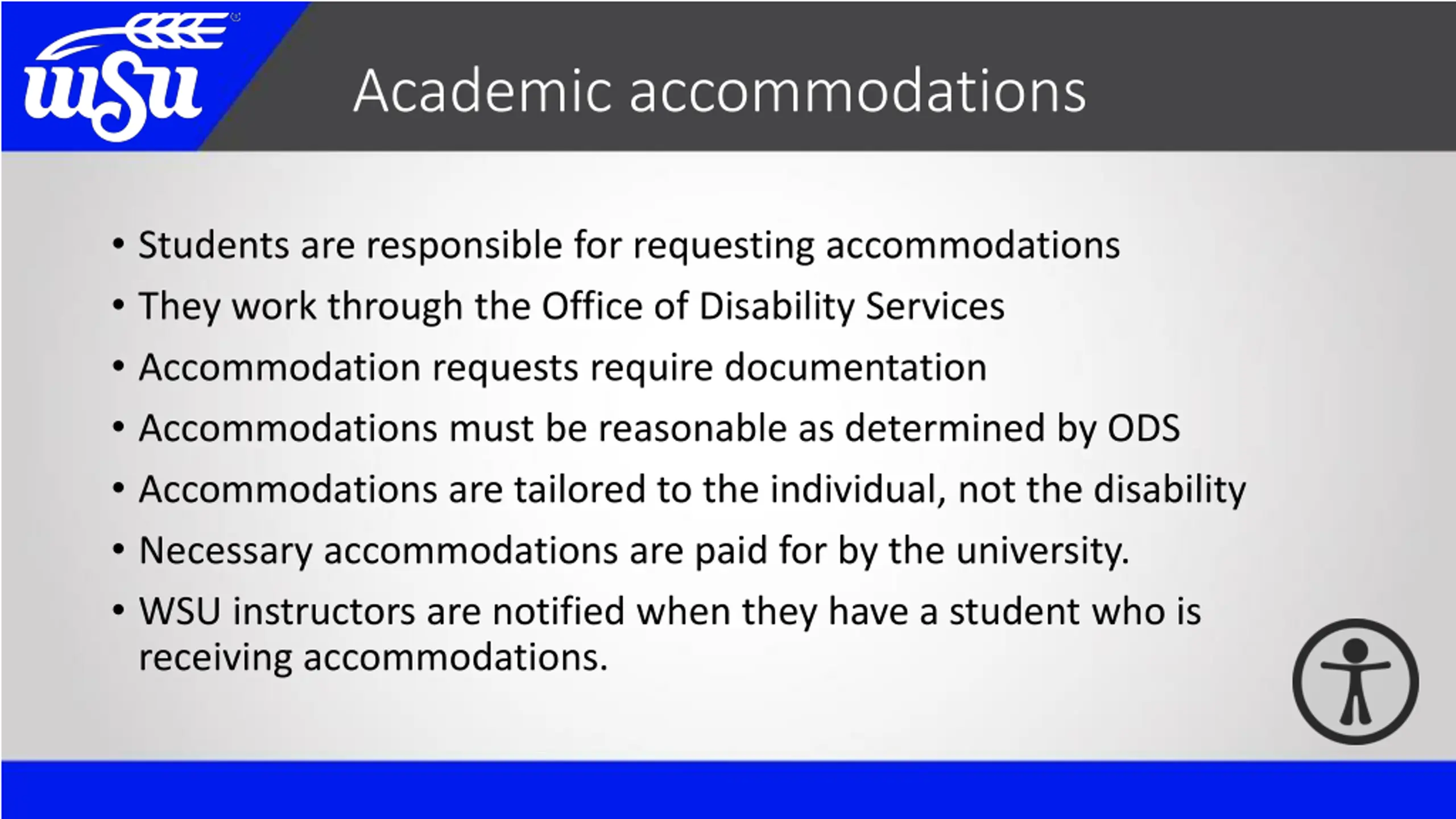 Academic accommodations Students are responsible for requesting accommodations They work through the Office of Disability Services Accommodation requests require documentation Accommodations must be reasonable as determined by ODS Accommodations are tailored to the individual, not the disability Necessary accommodations are paid for by the university. WSU instructors are notified when they have a student who is receiving accommodations.