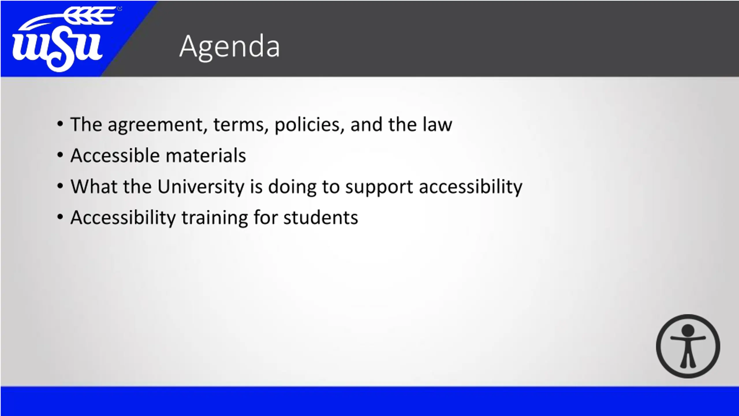 Agenda The agreement, terms, policies, and the law Accessible materials What the University is doing to support accessibility Accessibility training for students