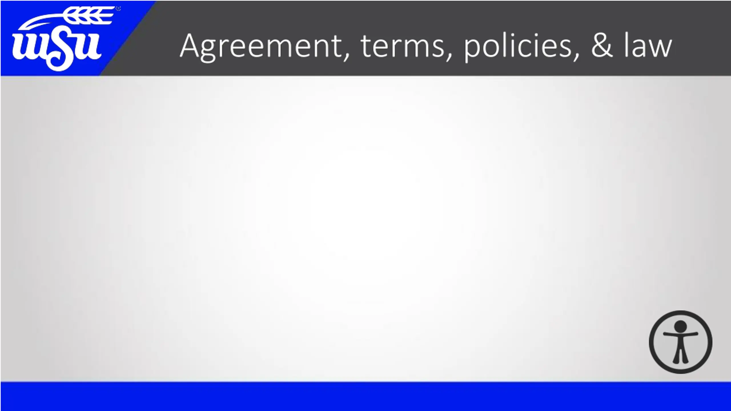 Relevant WSU policies 8.11, Accessible Content All University owned or contracted content, interfaces, and navigation elements to be used by WSU faculty, staff, students, or other WSU constituencies will be compliant with the Americans with Disability Act, as amended, and will be accessible to people with disabilities. All instructional materials, Electronic and Information Technology (EIT), LMS s and online courses created or used by a WSU department or instructional staff with any WSU academic course offering will be accessible to students with disabilities, and at the same time as they are available to any other student enrolled in that setting, to the best of WSU s ability.
