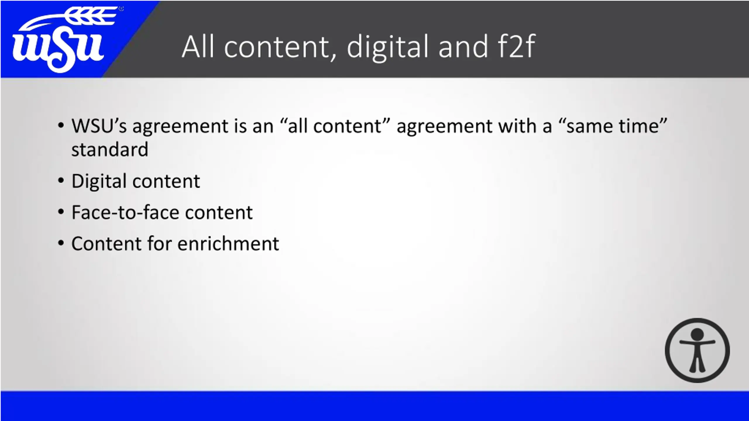 All content, digital and f2f WSU s agreement is an all content agreement with a same time standard Digital content Face-to-face content Content for enrichment