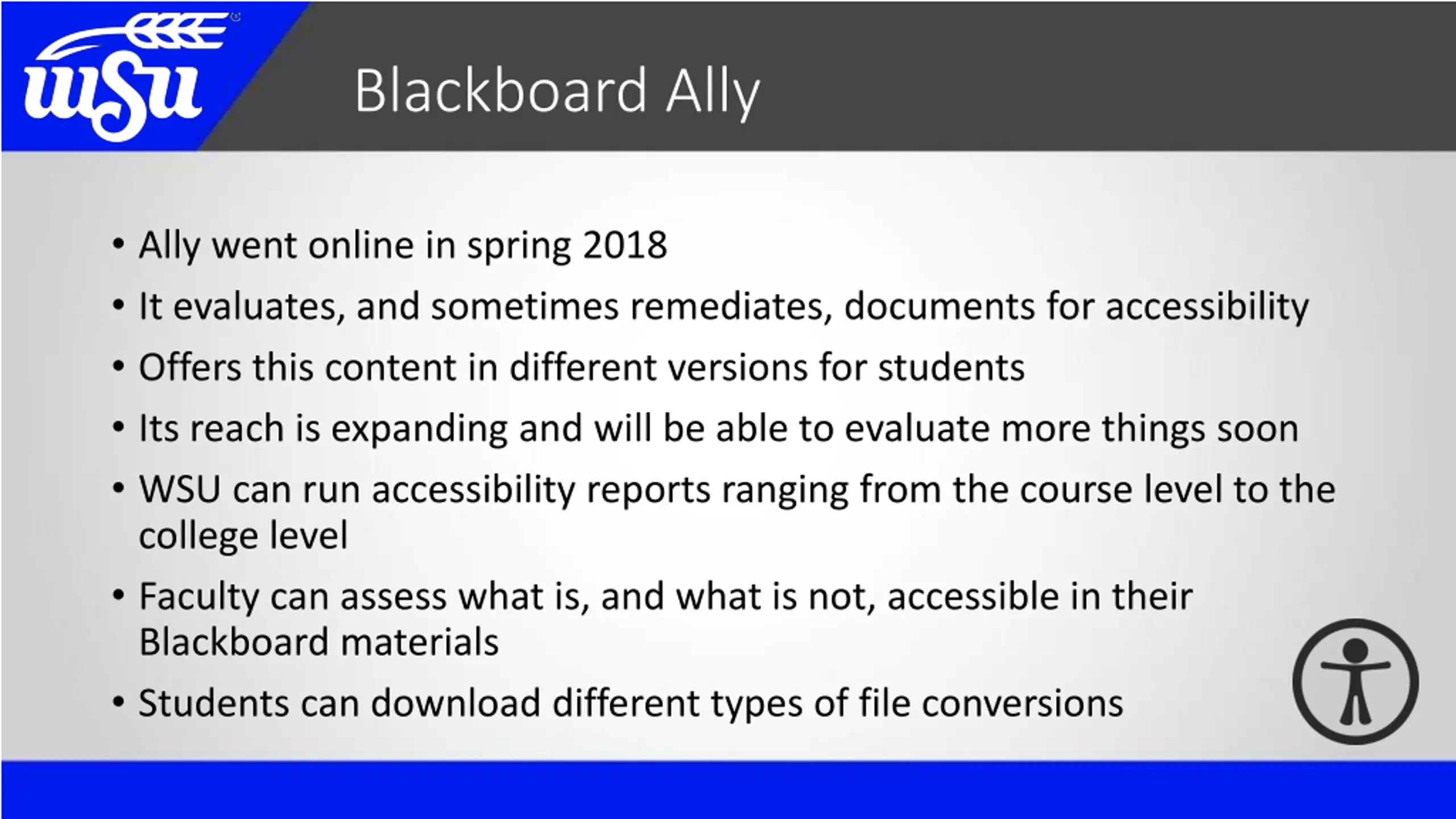 Blackboard Ally Ally went online in spring 2018 It evaluates, and sometimes remediates, documents for accessibility Offers this content in different versions for students Its reach is expanding and will be able to evaluate more things soon WSU can run accessibility reports ranging from the course level to the college level Faculty can assess what is, and what is not, accessible in their Blackboard materials Students can download different types of file conversions