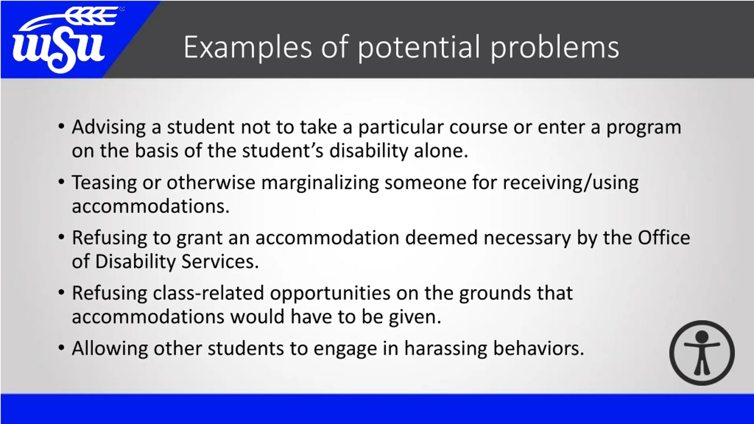 Examples of potential problems Advising a student not to take a particular course or enter a program on the basis of the student s disability alone. Teasing or otherwise marginalizing someone for receiving/using accommodations. Refusing to grant an accommodation deemed necessary by the Office of Disability Services. Refusing class-related opportunities on the grounds that accommodations would have to be given. Allowing other students to engage in harassing behaviors.