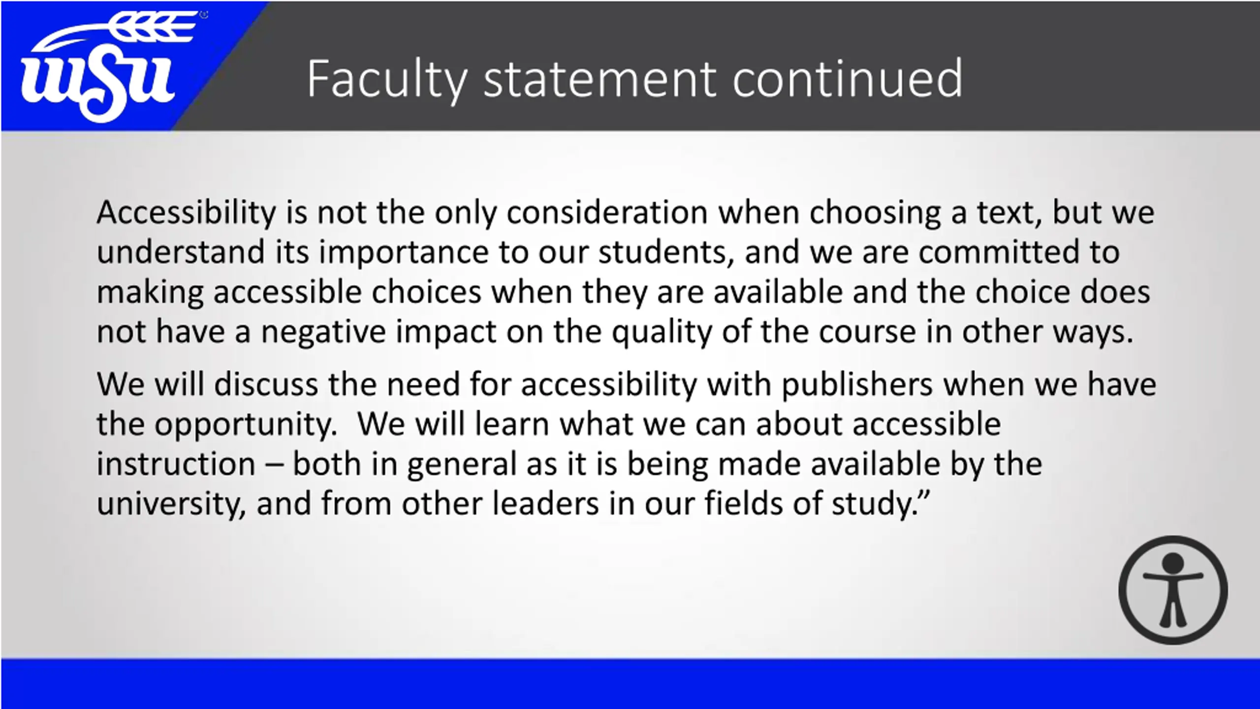 Faculty statement continued Accessibility is not the only consideration when choosing a text, but we understand its importance to our students, and we are committed to making accessible choices when they are available and the choice does not have a negative impact on the quality of the course in other ways. We will discuss the need for accessibility with publishers when we have the opportunity. We will learn what we can about accessible instruction both in general as it is being made available by the university, and from other leaders in our fields of study.