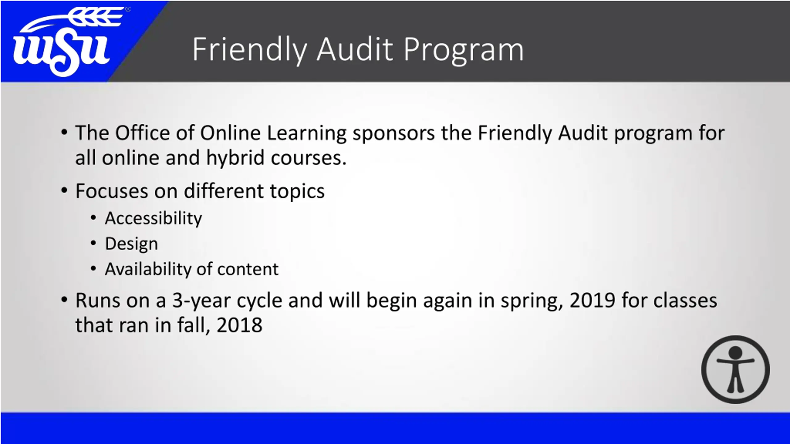 Friendly Audit Program The Office of Online Learning sponsors the Friendly Audit program for all online and hybrid courses. Focuses on different topics Accessibility Design Availability of content Runs on a 3-year cycle and will begin again in spring, 2019 for classes that ran in fall, 2018