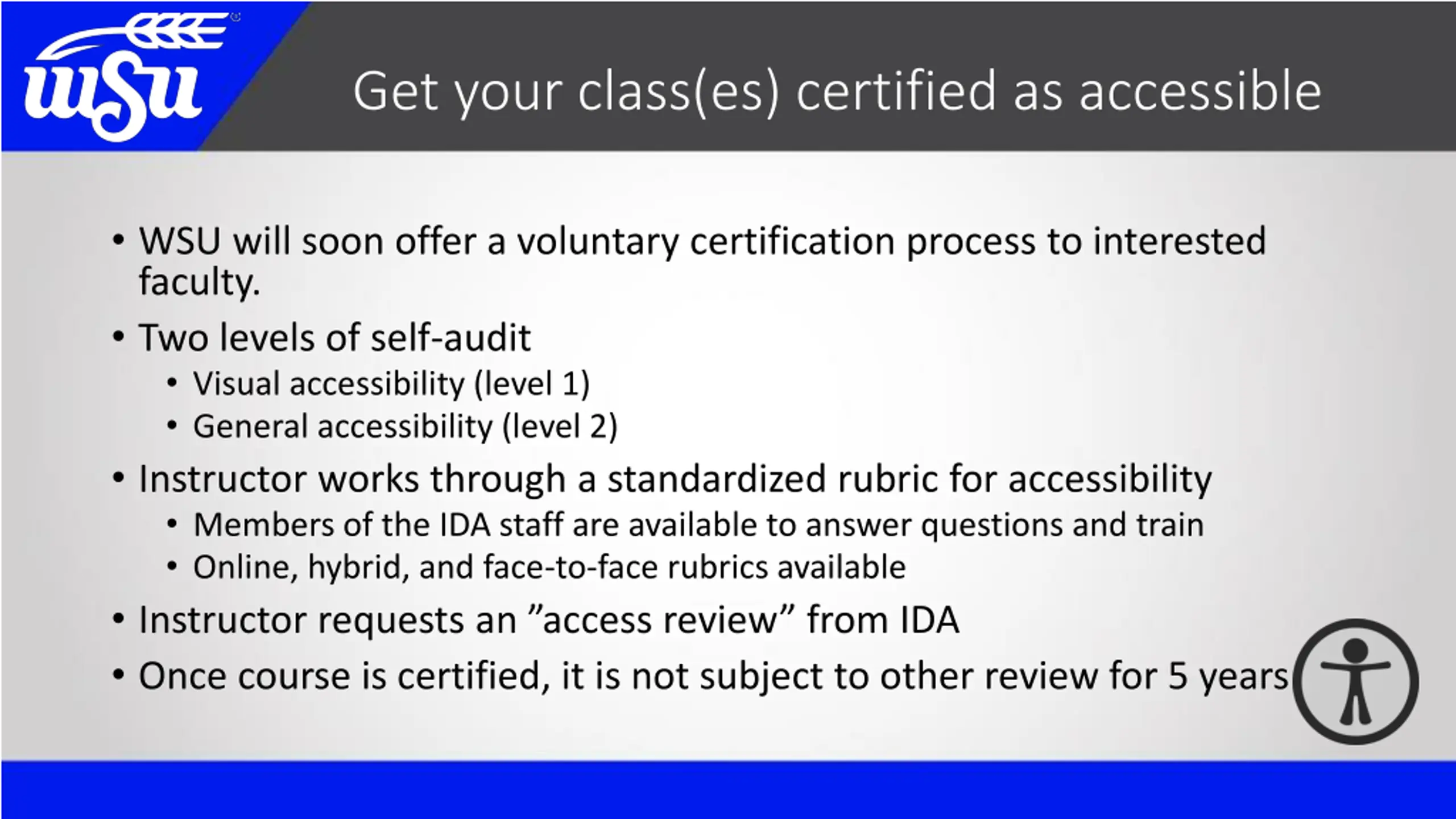 Get your class(es) certified as accessible WSU will soon offer a voluntary certification process to interested faculty. Two levels of self-audit Visual accessibility (level 1) General accessibility (level 2) Instructor works through a standardized rubric for accessibility Members of the IDA staff are available to answer questions and train Online, hybrid, and face-to-face rubrics available Instructor requests an access review from IDA Once course is certified, it is not subject to other review for 5 years