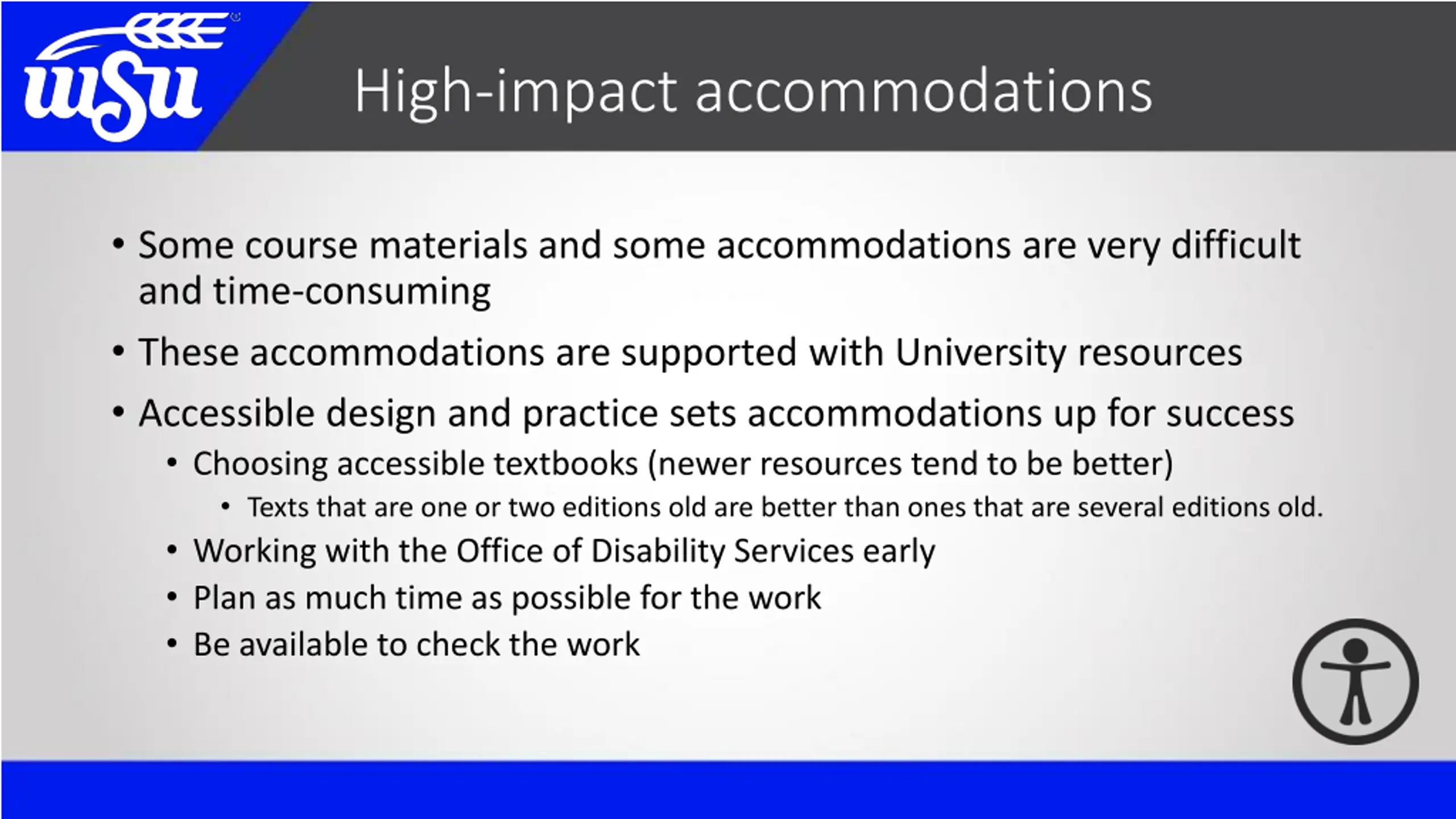 High-impact accommodations Some course materials and some accommodations are very difficult and time-consuming These accommodations are supported with University resources Accessible design and practice sets accommodations up for success Choosing accessible textbooks (newer resources tend to be better) Texts that are one or two editions old are better than ones that are several editions old. Working with the Office of Disability Services early Plan as much time as possible for the work Be available to check the work