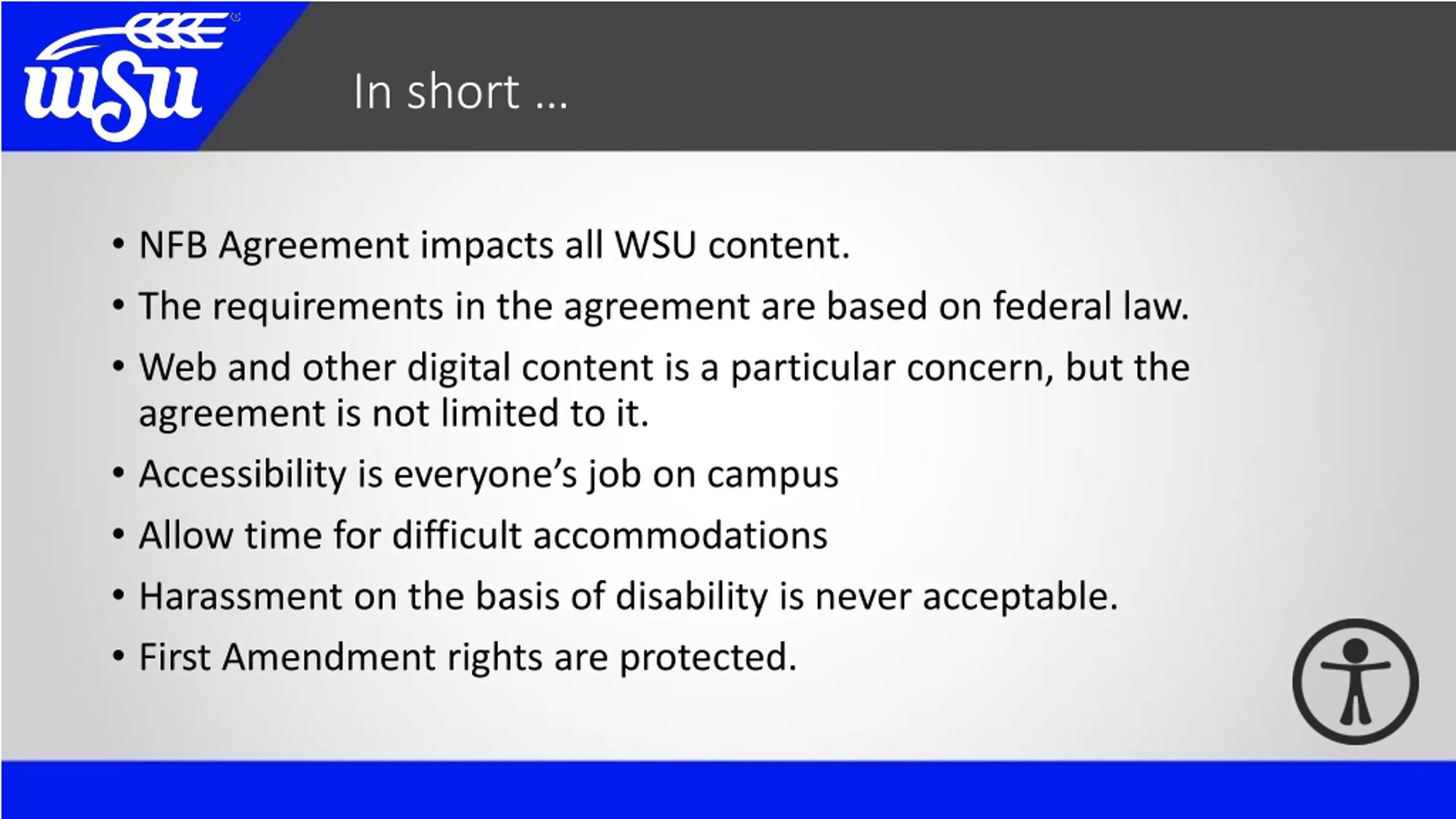 In short NFB Agreement impacts all WSU content. The requirements in the agreement are based on federal law. Web and other digital content is a particular concern, but the agreement is not limited to it. Accessibility is everyone s job on campus Allow time for difficult accommodations Harassment on the basis of disability is never acceptable. First Amendment rights are protected.