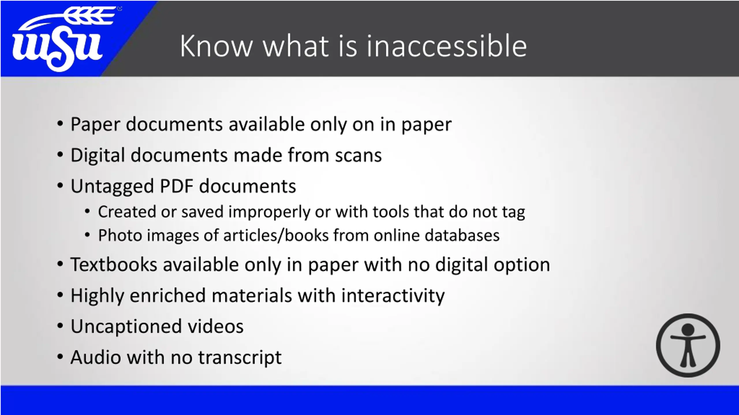Know what is inaccessible Paper documents available only on in paper Digital documents made from scans Untagged PDF documents Created or saved improperly or with tools that do not tag Photo images of articles/books from online databases Textbooks available only in paper with no digital option Highly enriched materials with interactivity Uncaptioned videos Audio with no transcript