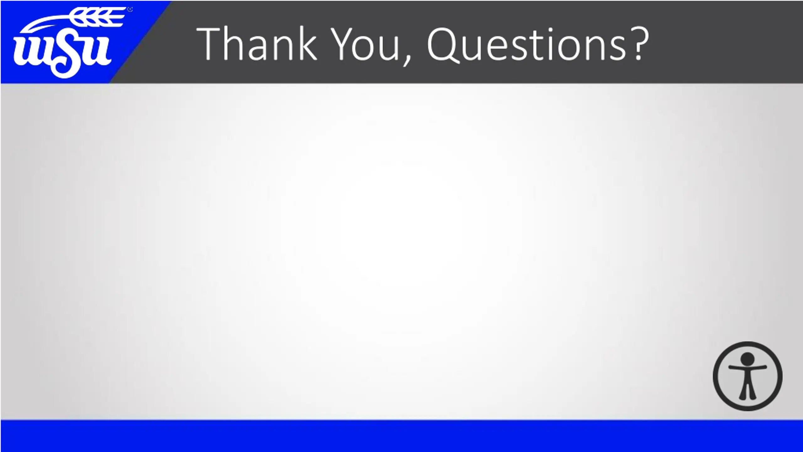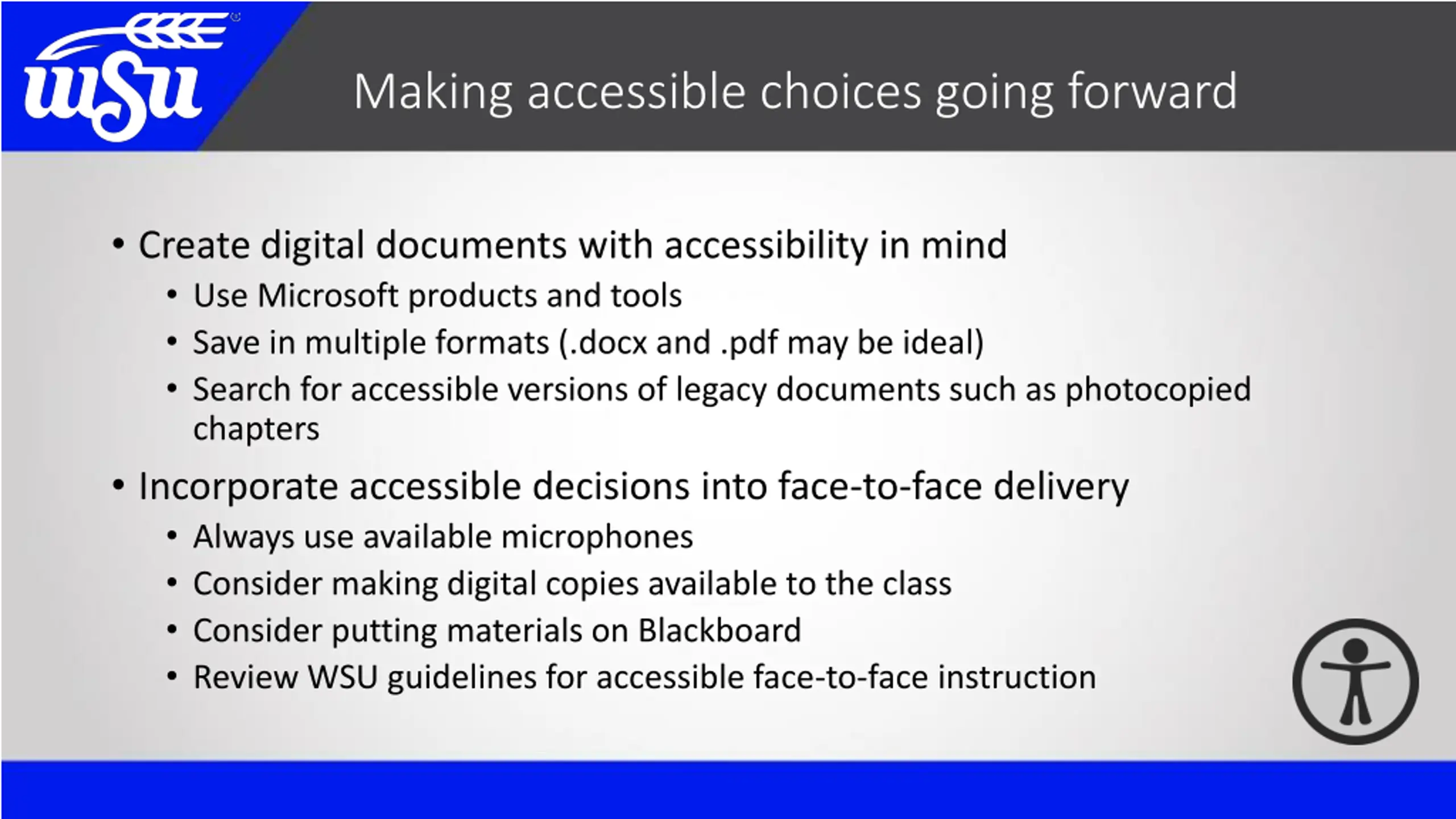Making accessible choices going forward Create digital documents with accessibility in mind Use Microsoft products and tools Save in multiple formats (.docx and .pdf may be ideal) Search for accessible versions of legacy documents such as photocopied chapters Incorporate accessible decisions into face-to-face delivery Always use available microphones Consider making digital copies available to the class Consider putting materials on Blackboard Review WSU guidelines for accessible face-to-face instruction
