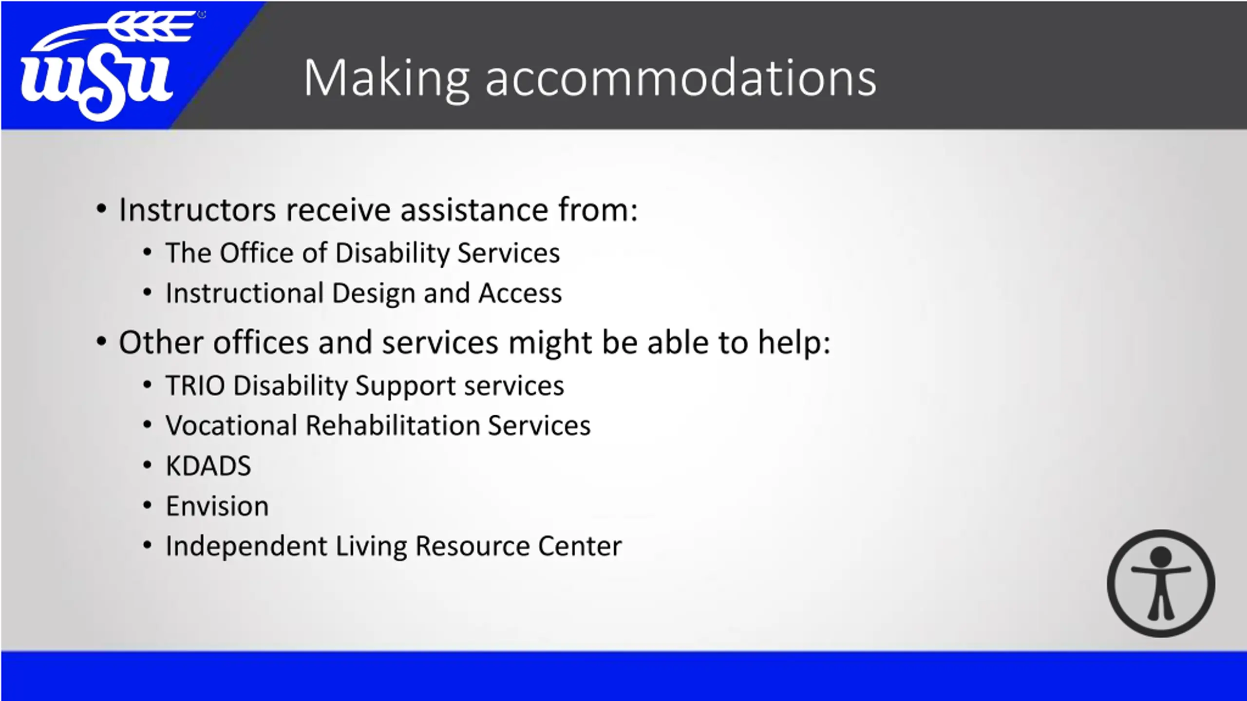 Making accommodations Instructors receive assistance from: The Office of Disability Services Instructional Design and Access Other offices and services might be able to help: TRIO Disability Support services Vocational Rehabilitation Services KDADS Envision Independent Living Resource Center