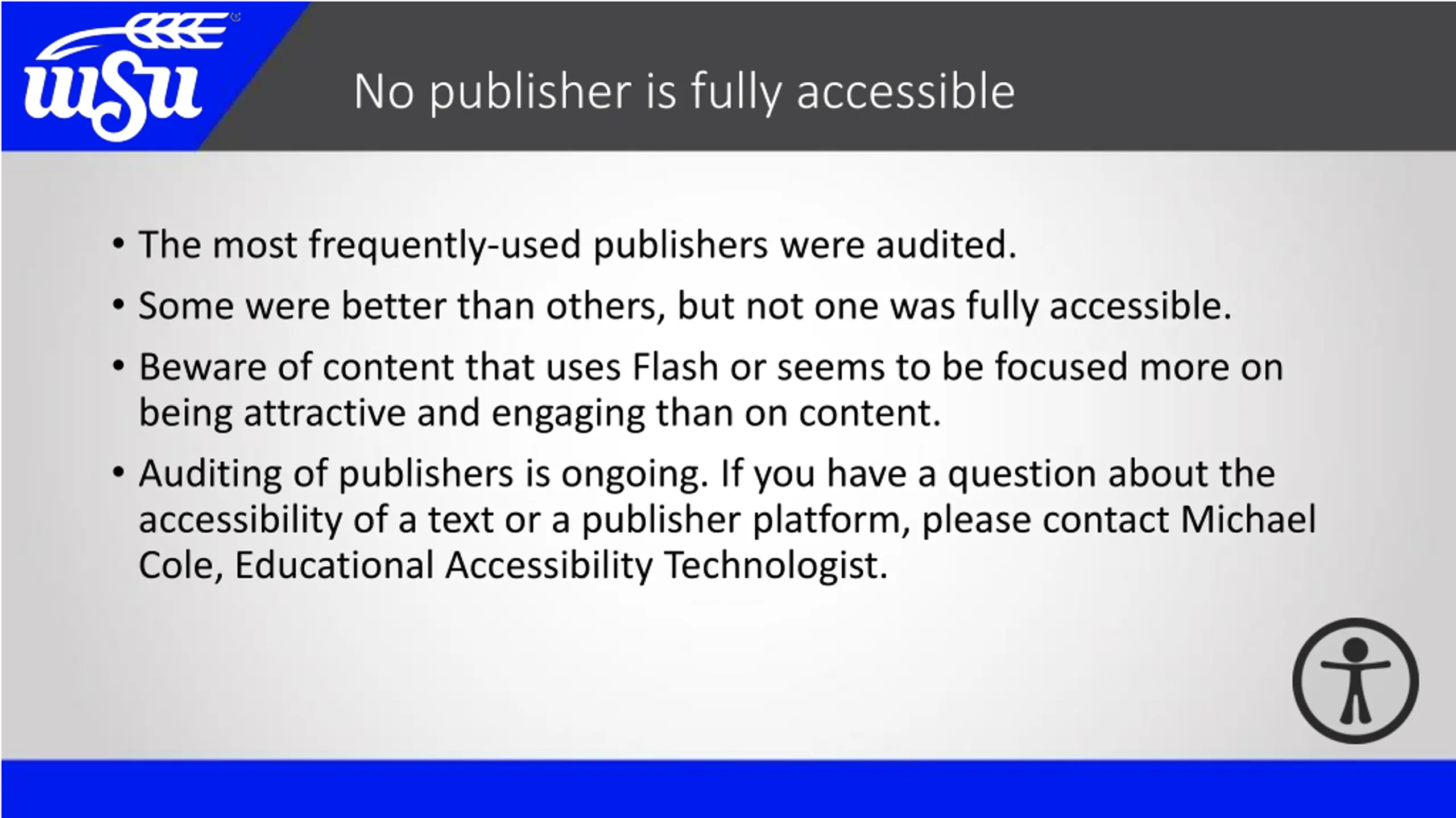 No publisher is fully accessible The most frequently-used publishers were audited. Some were better than others, but not one was fully accessible. Beware of content that uses Flash or seems to be focused more on being attractive and engaging than on content. Auditing of publishers is ongoing. If you have a question about the accessibility of a text or a publisher platform, please contact Michael Cole, Educational Accessibility Technologist.