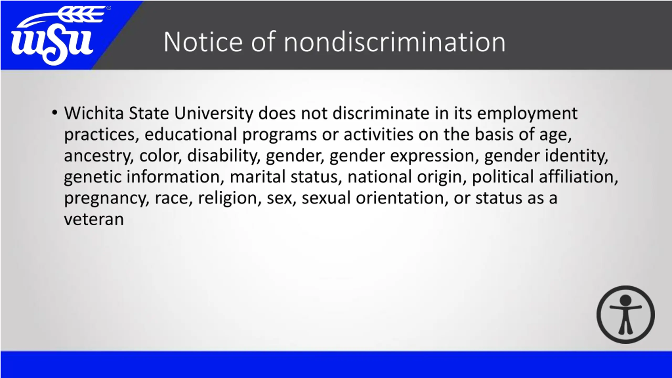 Notice of nondiscrimination Wichita State University does not discriminate in its employment practices, educational programs or activities on the basis of age, ancestry, color, disability, gender, gender expression, gender identity, genetic information, marital status, national origin, political affiliation, pregnancy, race, religion, sex, sexual orientation, or status as a veteran