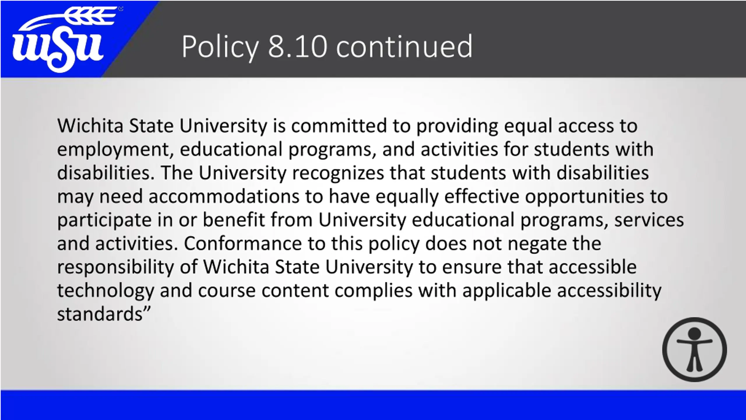 Policy 8.10 continued Wichita State University is committed to providing equal access to employment, educational programs, and activities for students with disabilities. The University recognizes that students with disabilities may need accommodations to have equally effective opportunities to participate in or benefit from University educational programs, services and activities. Conformance to this policy does not negate the responsibility of Wichita State University to ensure that accessible technology and course content complies with applicable accessibility standards