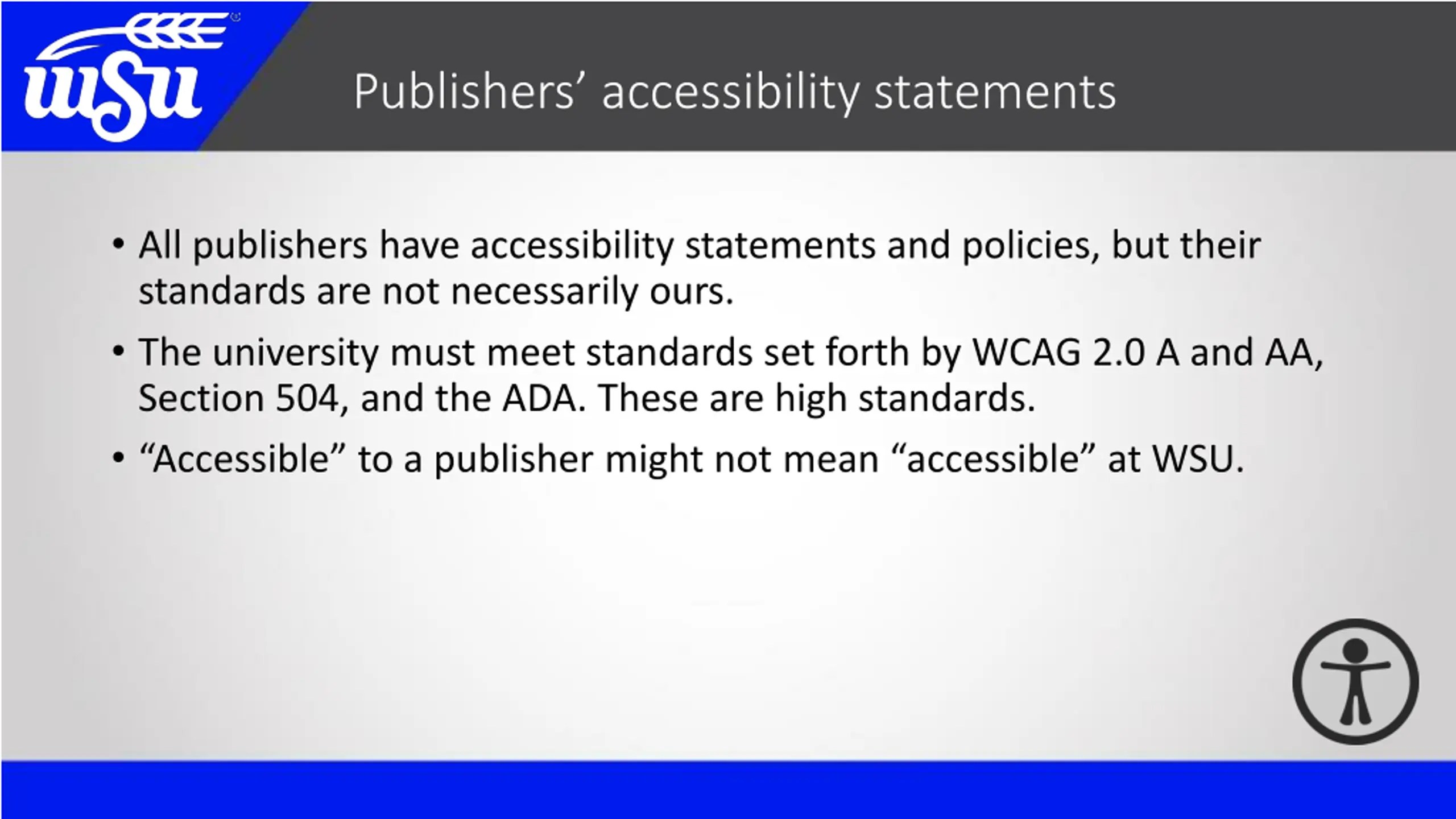 Publishers accessibility statements All publishers have accessibility statements and policies, but their standards are not necessarily ours. The university must meet standards set forth by WCAG 2.0 A and AA, Section 504, and the ADA. These are high standards. Accessible to a publisher might not mean accessible at WSU.