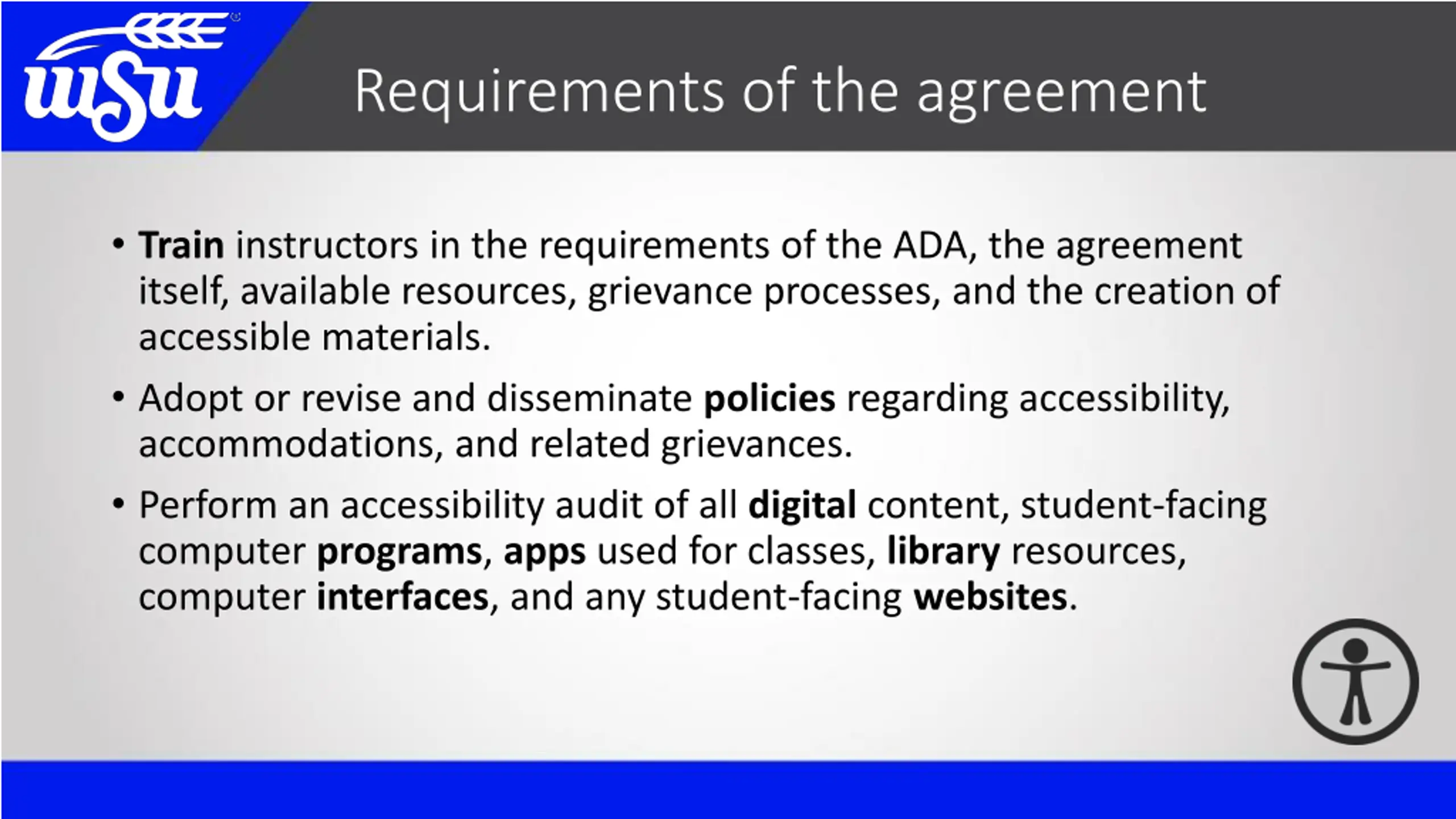 WSUs agreement continued Ensure all inaccessible technologies are accessible by 2020. Ensure that all instructional materials, co-curricular materials, and online courses used in connection with any WSU course offering are accessible by July 29, 2020. Provide print textbooks in alternate accessible formats as necessary. Ensure that WSU s public website is accessible in accordance with WCAG 2.0 level AA standards.