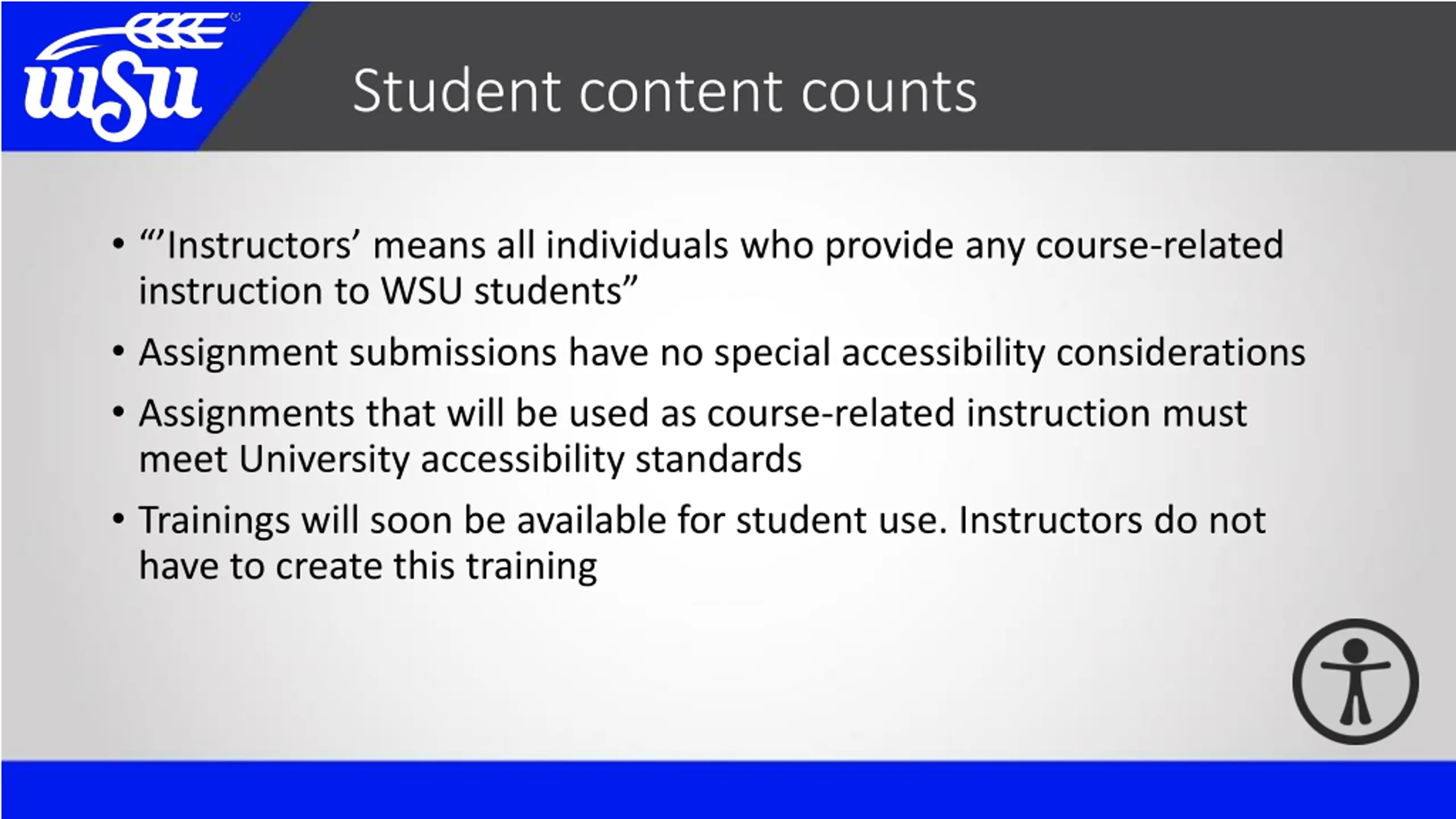 Student content counts Instructors means all individuals who provide any course-related instruction to WSU students Assignment submissions have no special accessibility considerations Assignments that will be used as course-related instruction must meet University accessibility standards Trainings will soon be available for student use. Instructors do not have to create this training