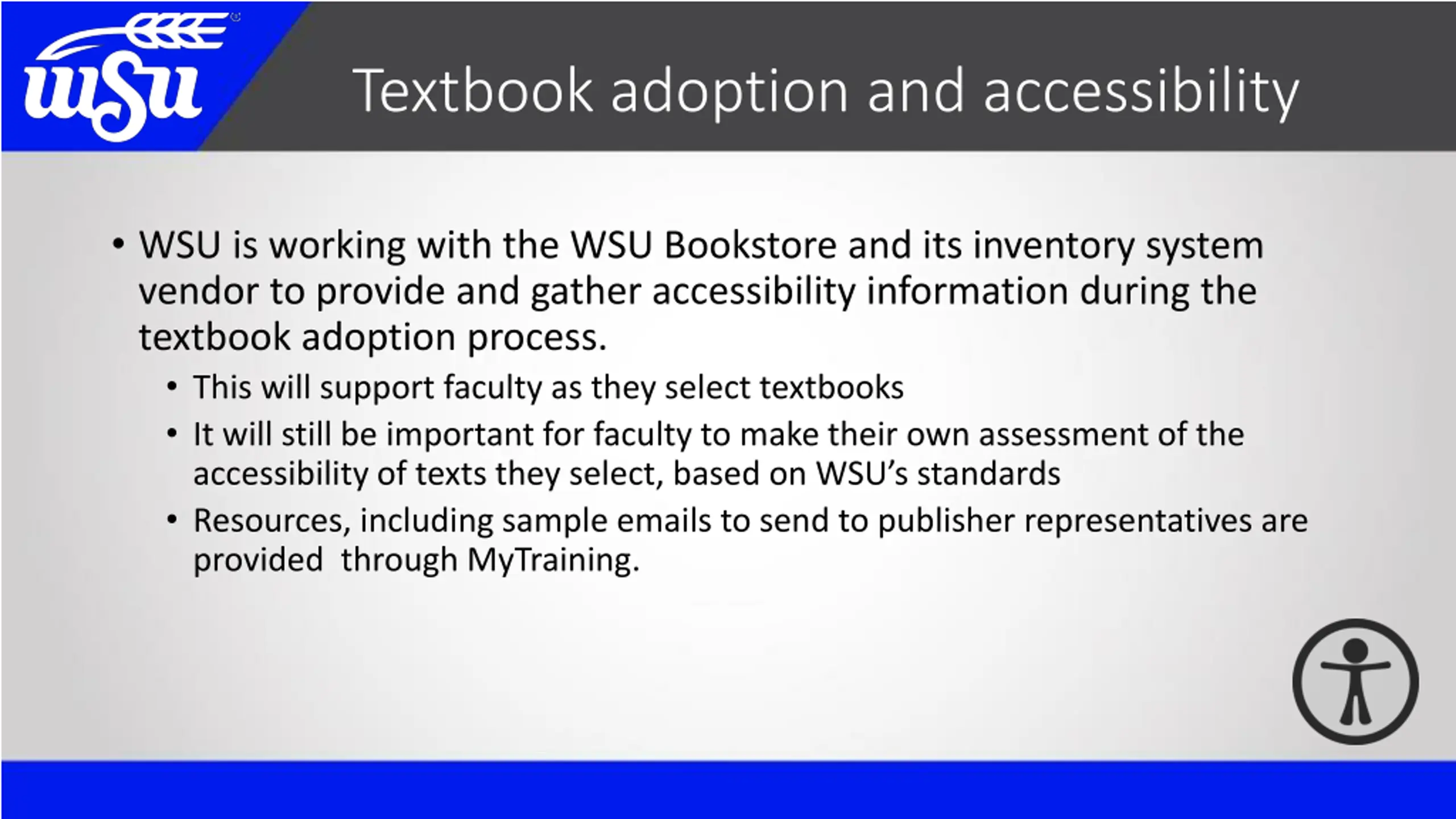 Textbook adoption and accessibility WSU is working with the WSU Bookstore and its inventory system vendor to provide and gather accessibility information during the textbook adoption process. This will support faculty as they select textbooks It will still be important for faculty to make their own assessment of the accessibility of texts they select, based on WSU s standards Resources, including sample emails to send to publisher representatives are provided through MyTraining.