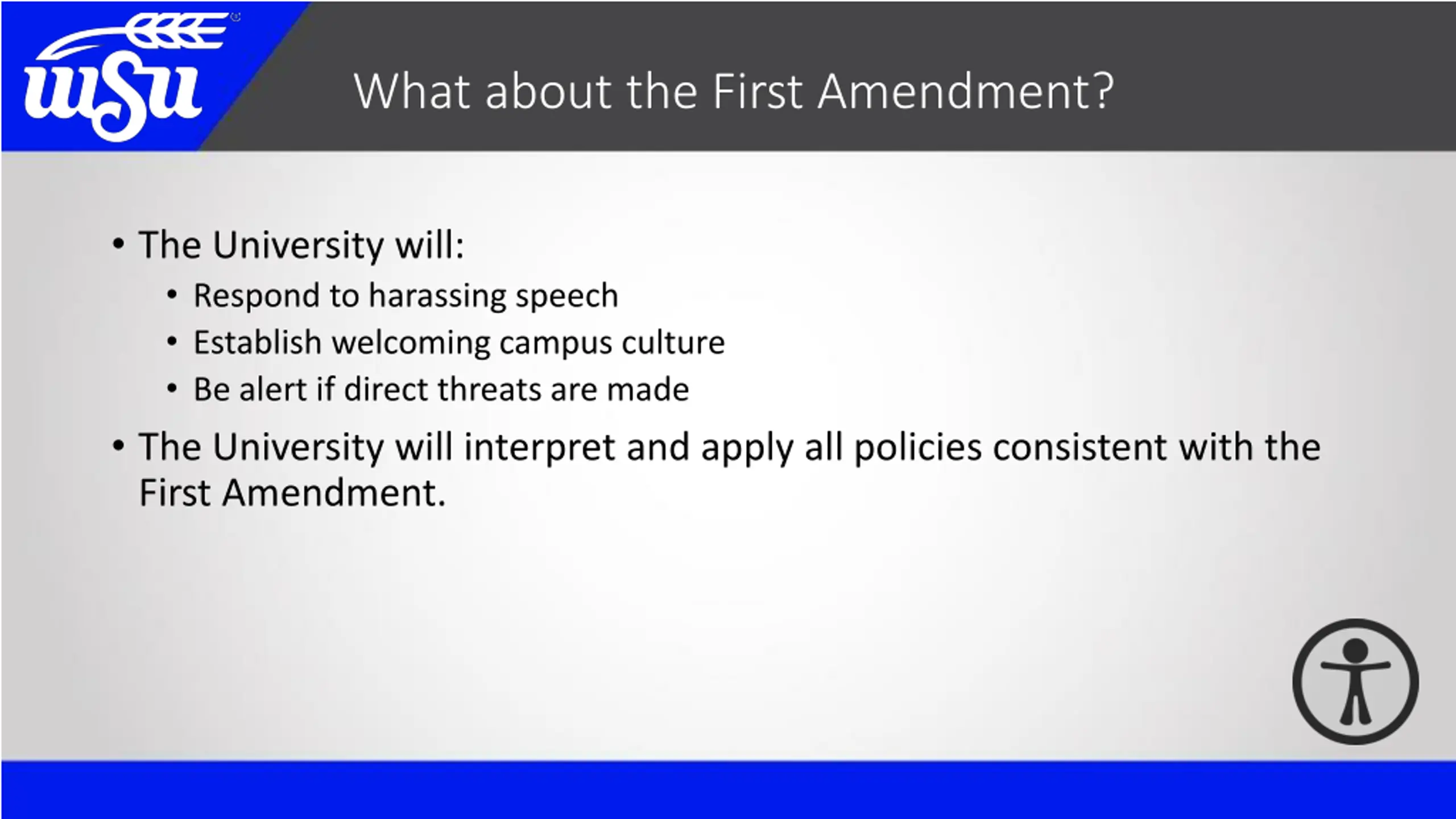 What about the First Amendment? The University will: Respond to harassing speech Establish welcoming campus culture Be alert if direct threats are made The University will interpret and apply all policies consistent with the First Amendment.