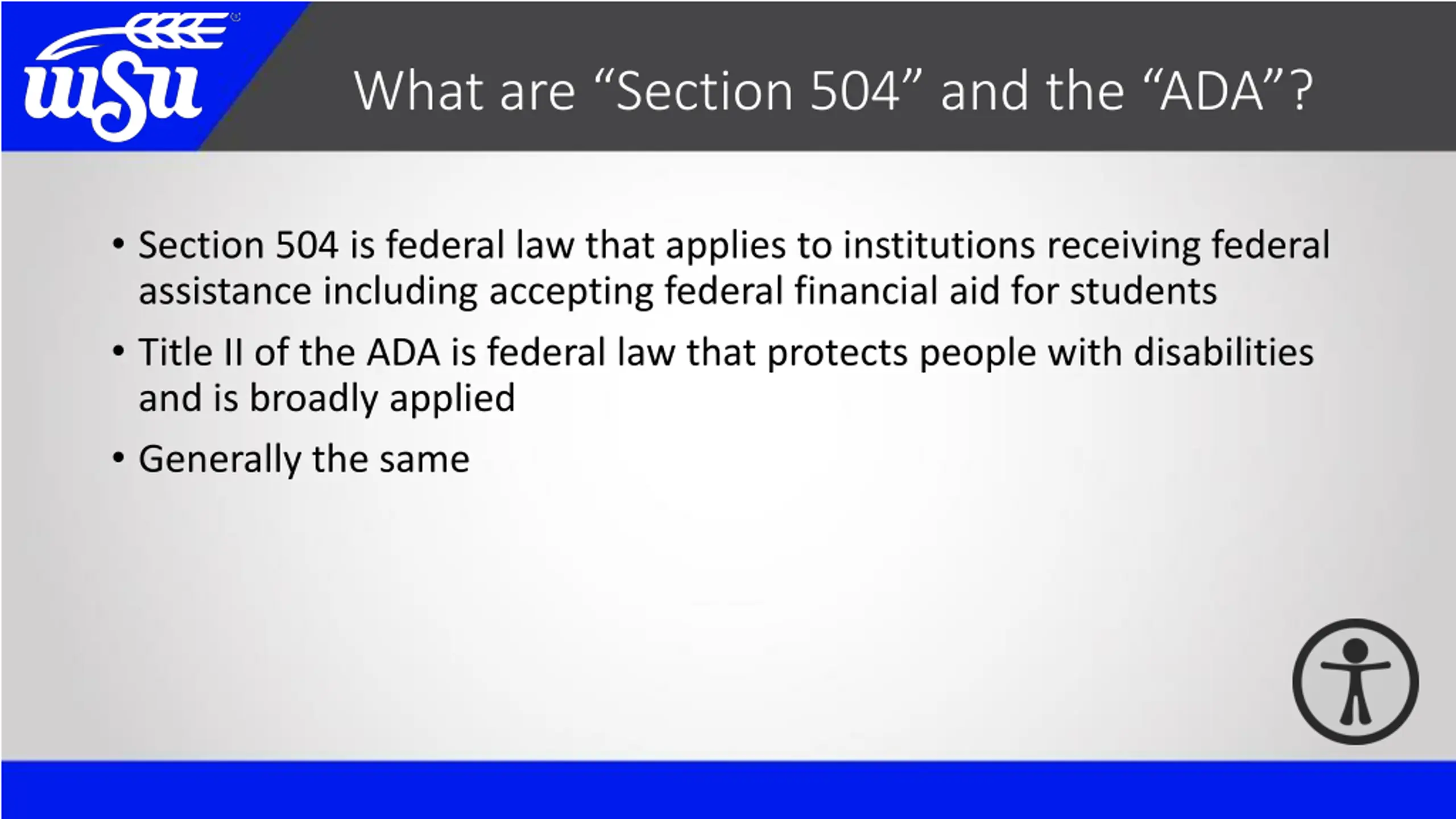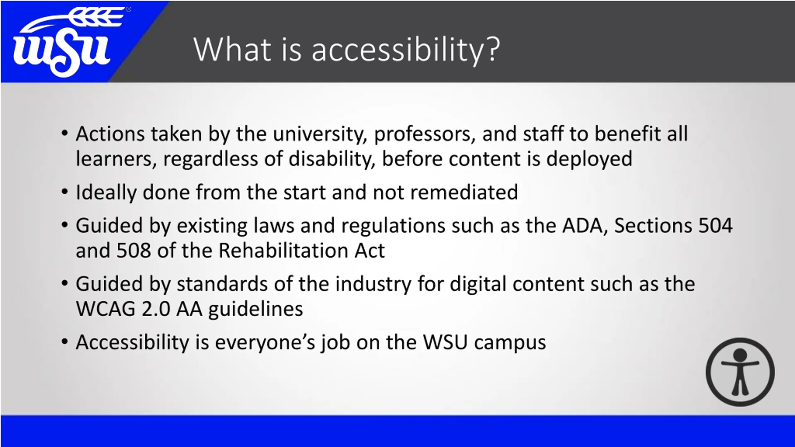 What is accessibility? Actions taken by the university, professors, and staff to benefit all learners, regardless of disability, before content is deployed Ideally done from the start and not remediated Guided by existing laws and regulations such as the ADA, Sections 504 and 508 of the Rehabilitation Act Guided by standards of the industry for digital content such as the WCAG 2.0 AA guidelines Accessibility is everyone s job on the WSU campus