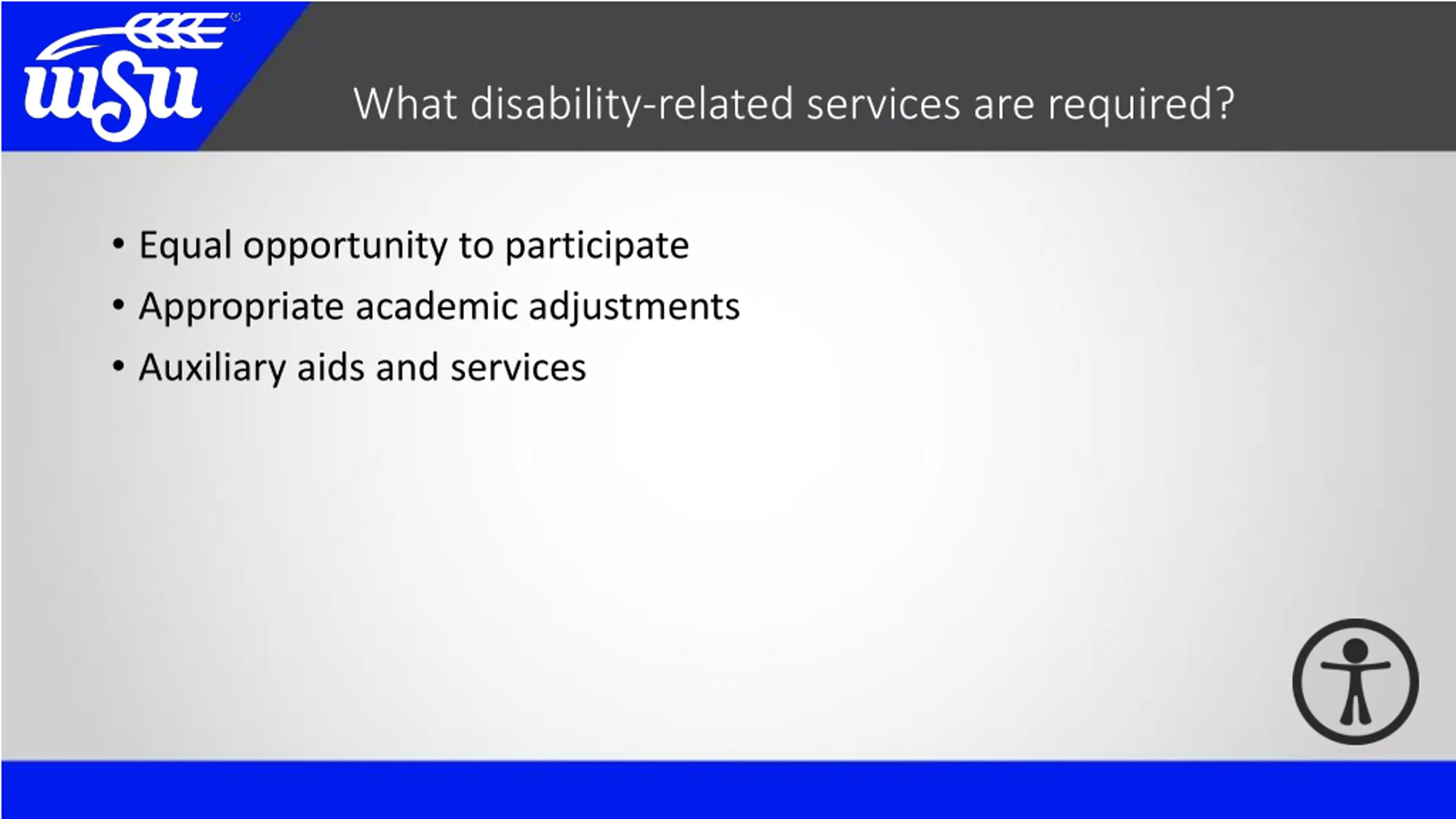 What disability-related services are required? Equal opportunity to participate Appropriate academic adjustments Auxiliary aids and services