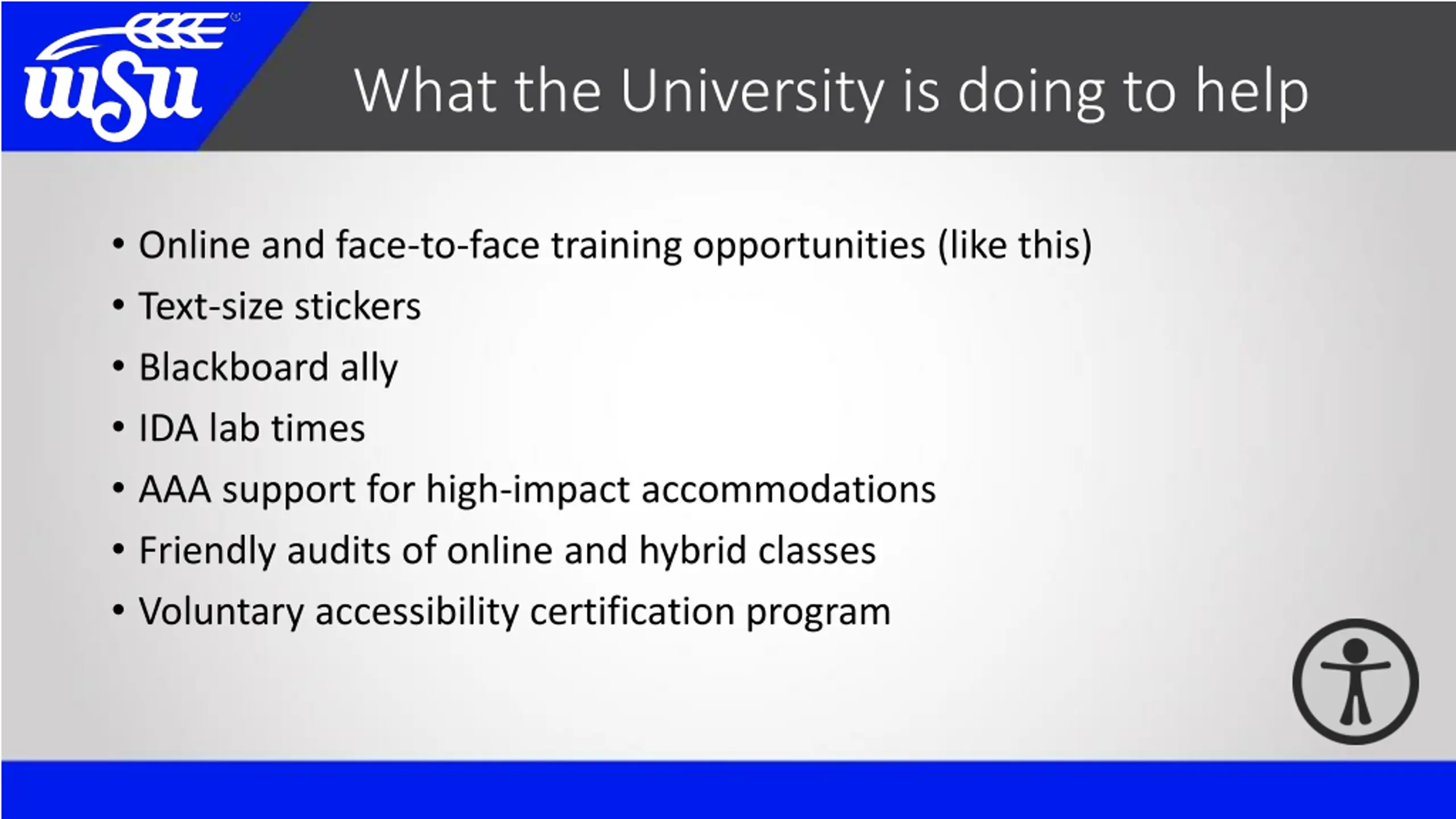 What the University is doing to help Online and face-to-face training opportunities (like this) Text-size stickers Blackboard ally IDA lab times AAA support for high-impact accommodations Friendly audits of online and hybrid classes Voluntary accessibility certification program