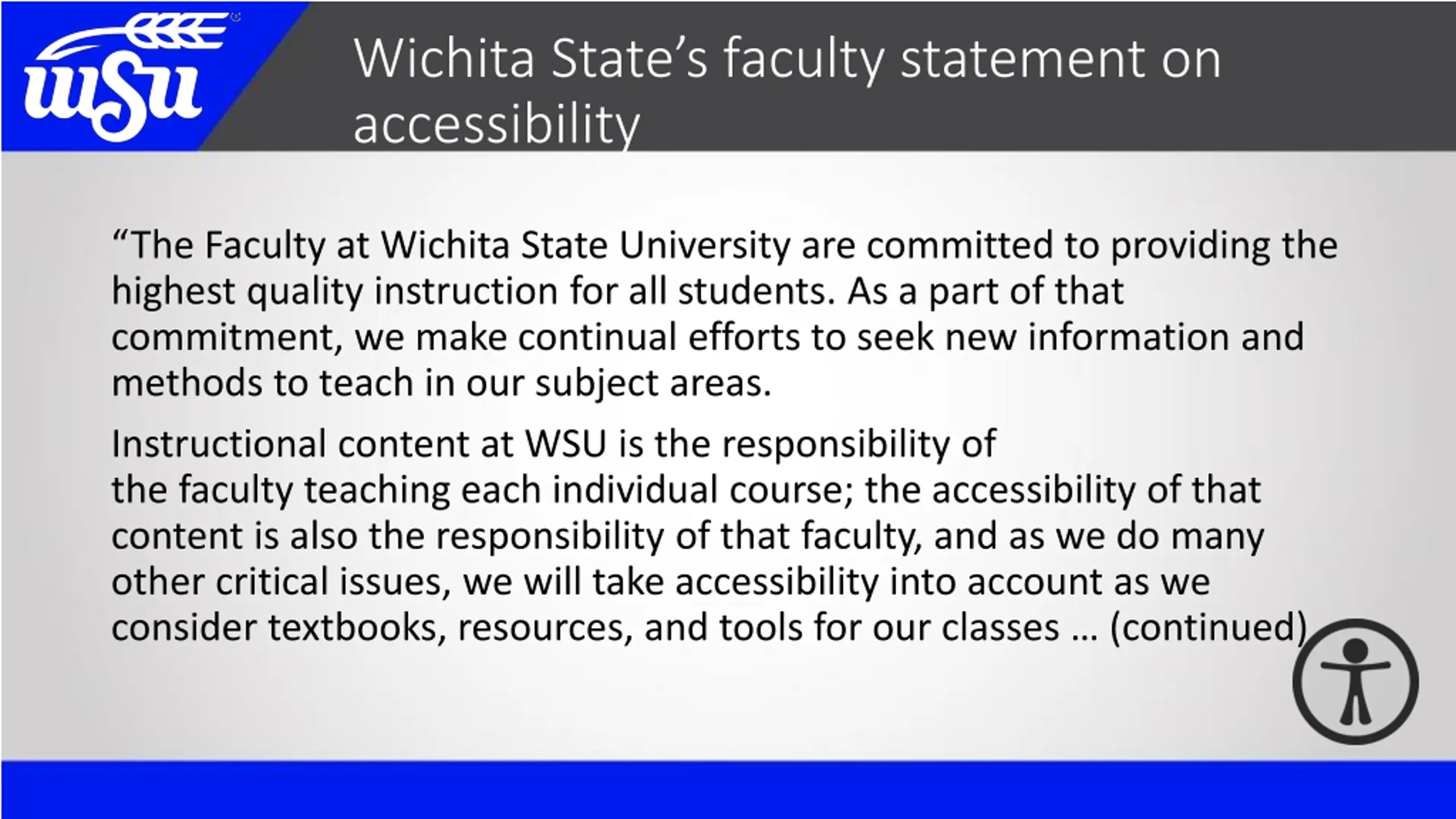 Wichita States faculty statement on accessibility The Faculty at Wichita State University are committed to providing the highest quality instruction for all students. As a part of that commitment, we make continual efforts to seek new information and methods to teach in our subject areas. Instructional content at WSU is the responsibility of the faculty teaching each individual course; the accessibility of that content is also the responsibility of that faculty, and as we do many other critical issues, we will take accessibility into account as we consider textbooks, resources, and tools for our classes (continued)