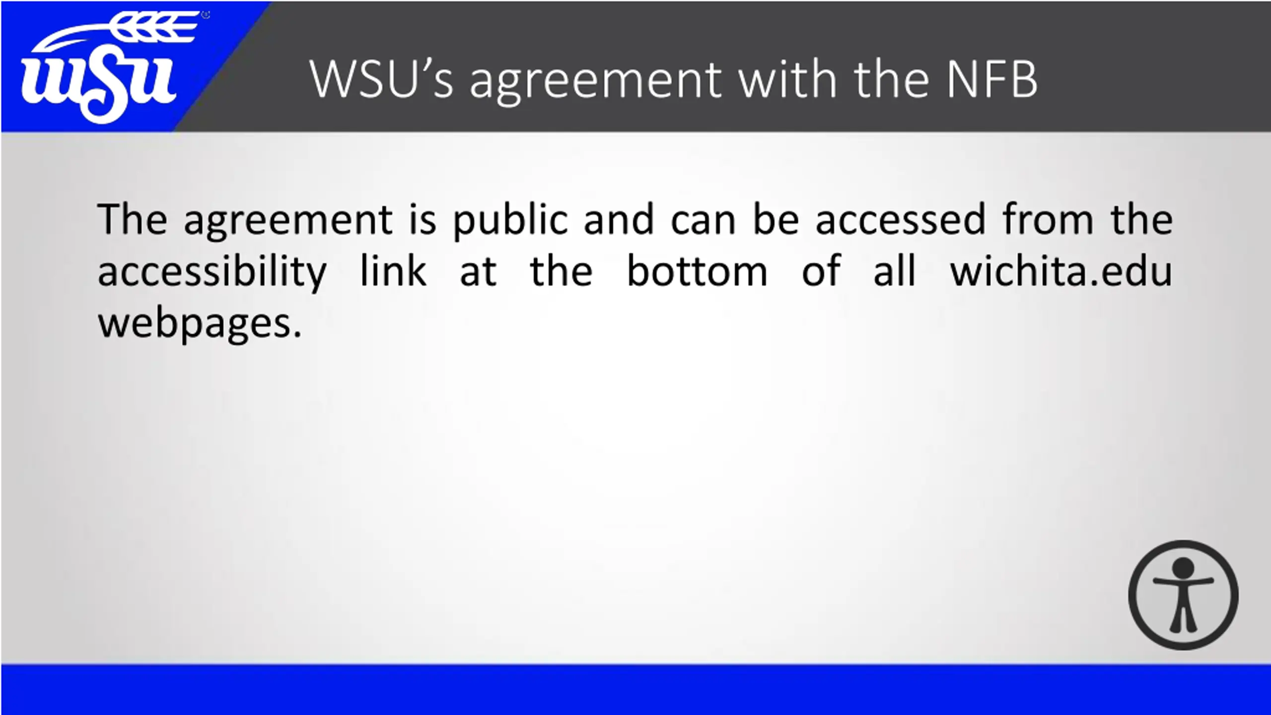 WSUs agreement with the NFB The agreement is public and can be accessed from the accessibility link at the bottom of all wichita.edu webpages.