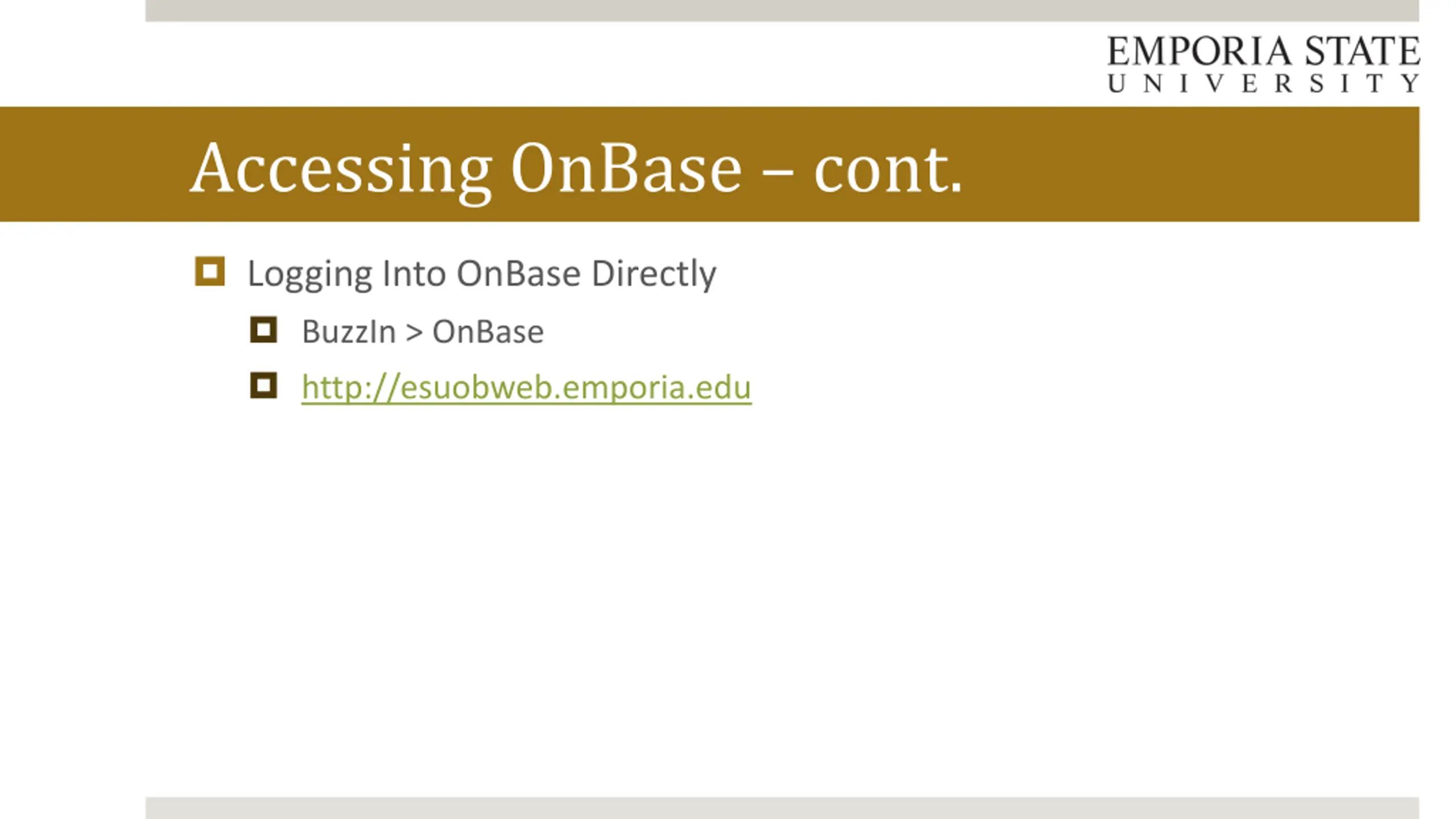 Accessing OnBase cont. Logging Into OnBase Directly BuzzIn > OnBase http://esuobweb.emporia.edu