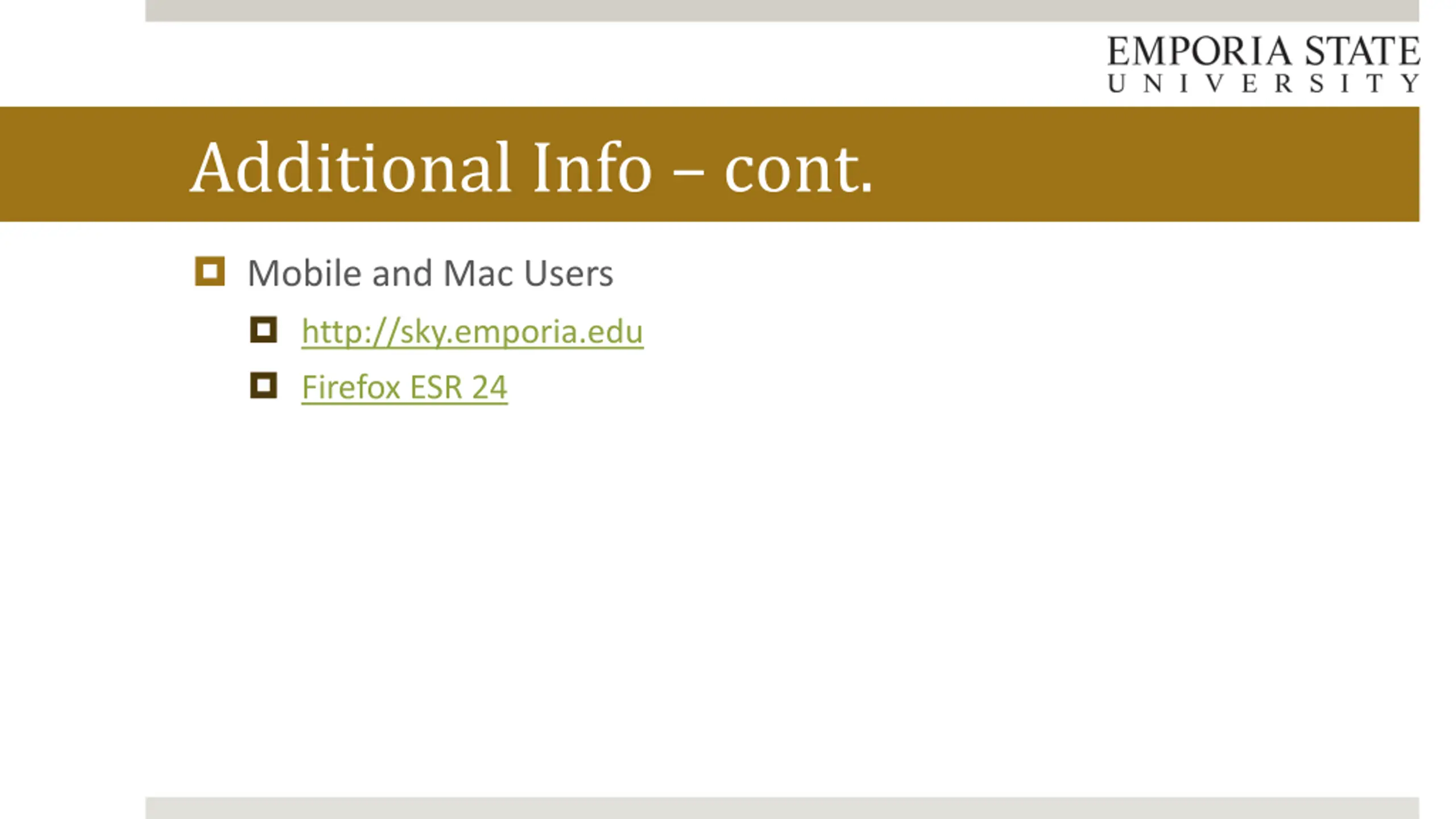 Additional Info cont. Mobile and Mac Users http://sky.emporia.edu Firefox ESR 24