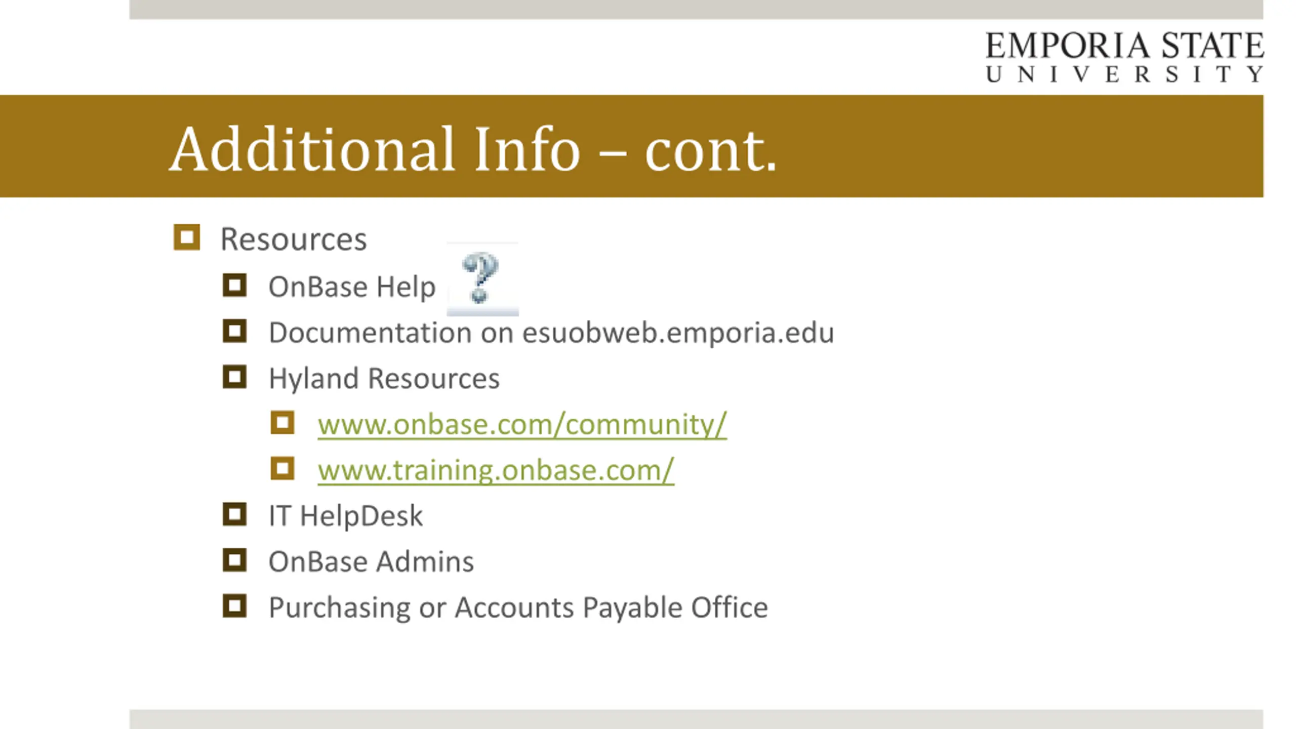 Additional Info cont. Resources OnBase Help Documentation on esuobweb.emporia.edu Hyland Resources www.onbase.com/community/ www.training.onbase.com/ IT HelpDesk OnBase Admins Purchasing or Accounts Payable Office