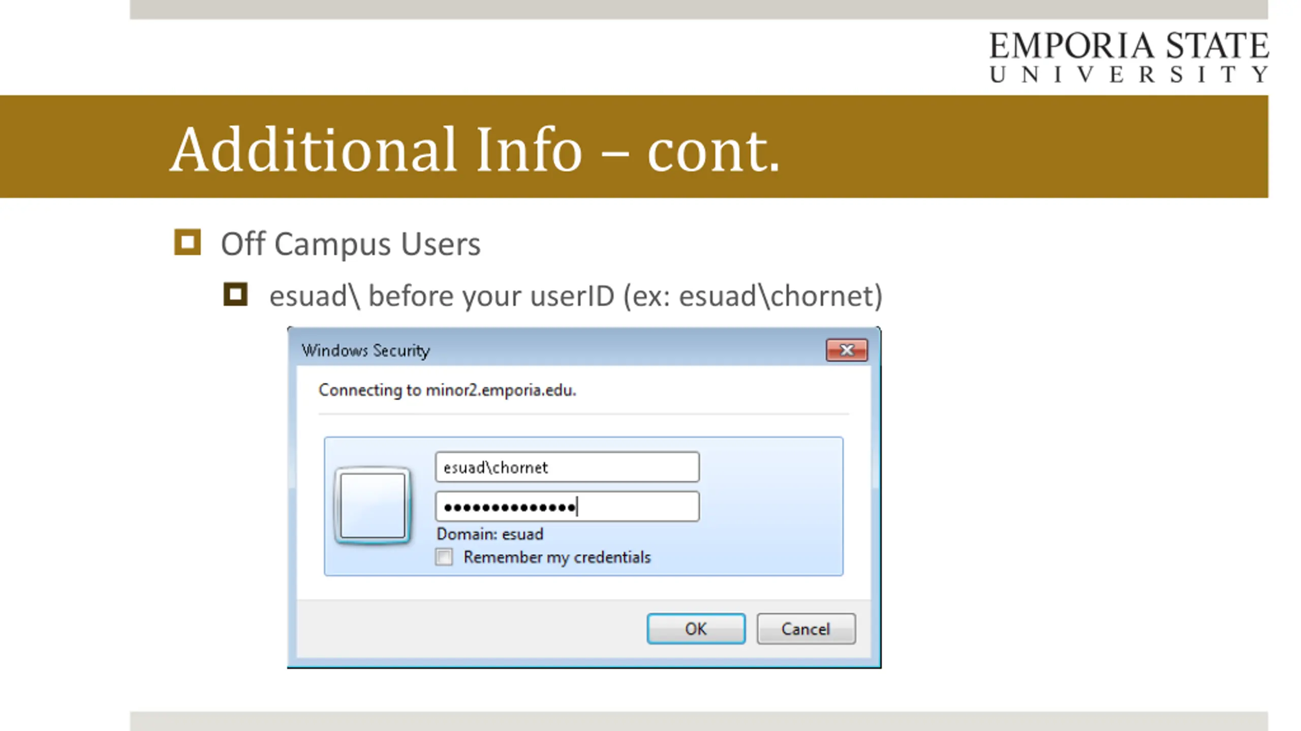 Additional Info cont. Off Campus Users esuad\ before your userID (ex: esuad\chornet)
