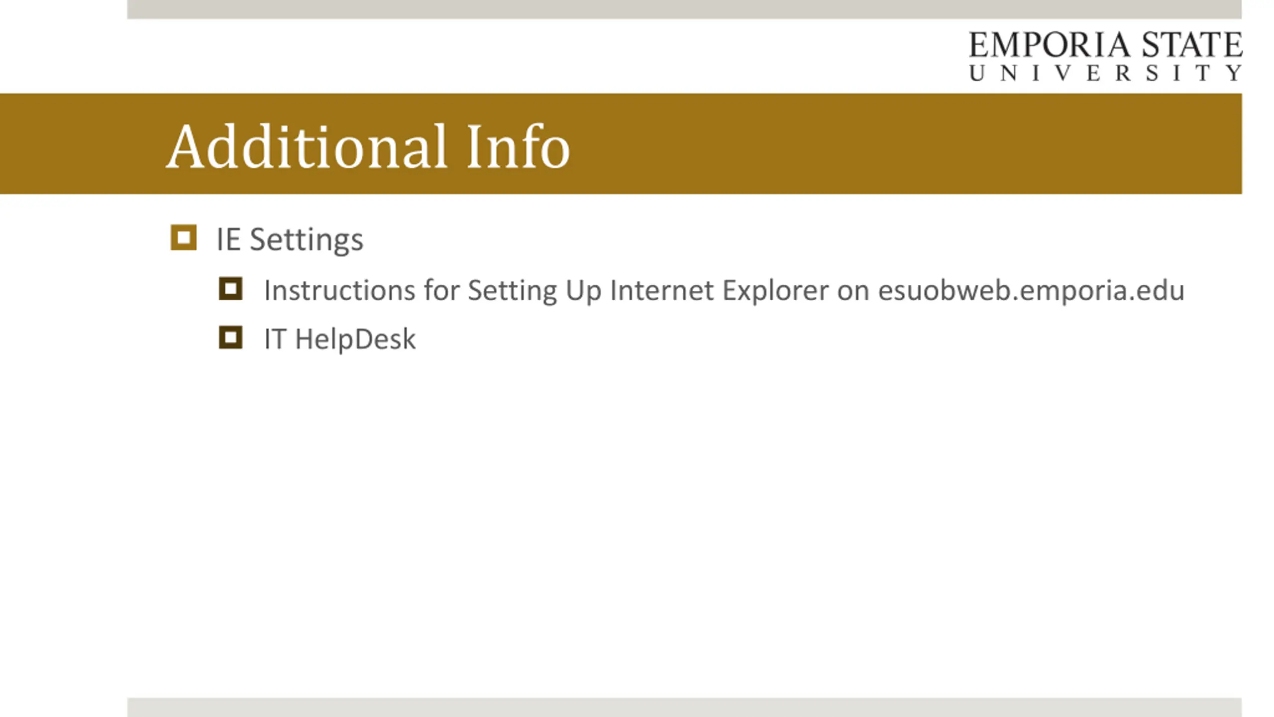 Additional Info IE Settings Instructions for Setting Up Internet Explorer on esuobweb.emporia.edu IT HelpDesk