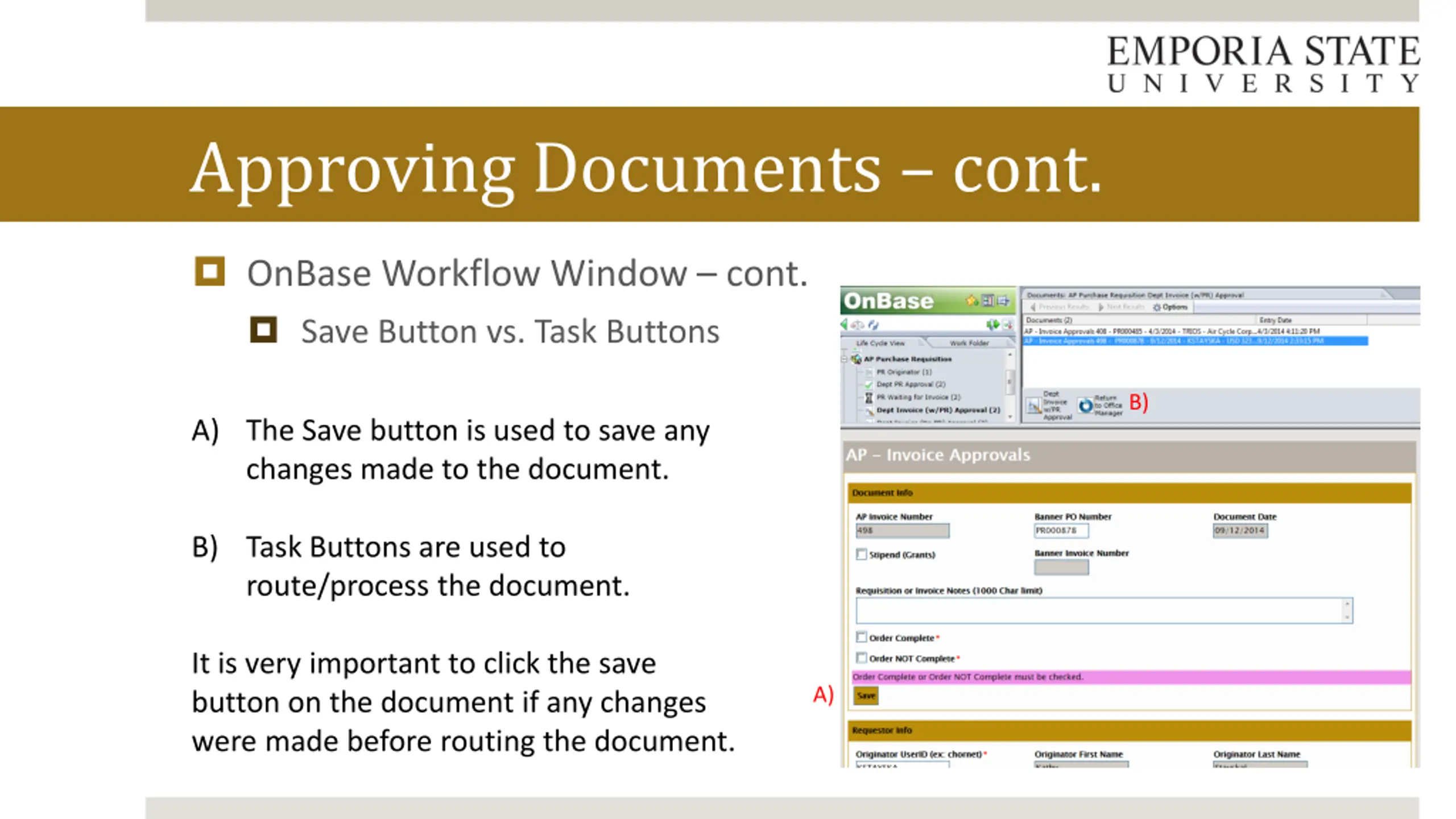 Approving Documents cont. OnBase Workflow Window cont. Save Button vs. Task Buttons B) A) The Save button is used to save any changes made to the document. B) Task Buttons are used to route/process the document. It is very important to click the save button on the document if any changes were made before routing the document. A)