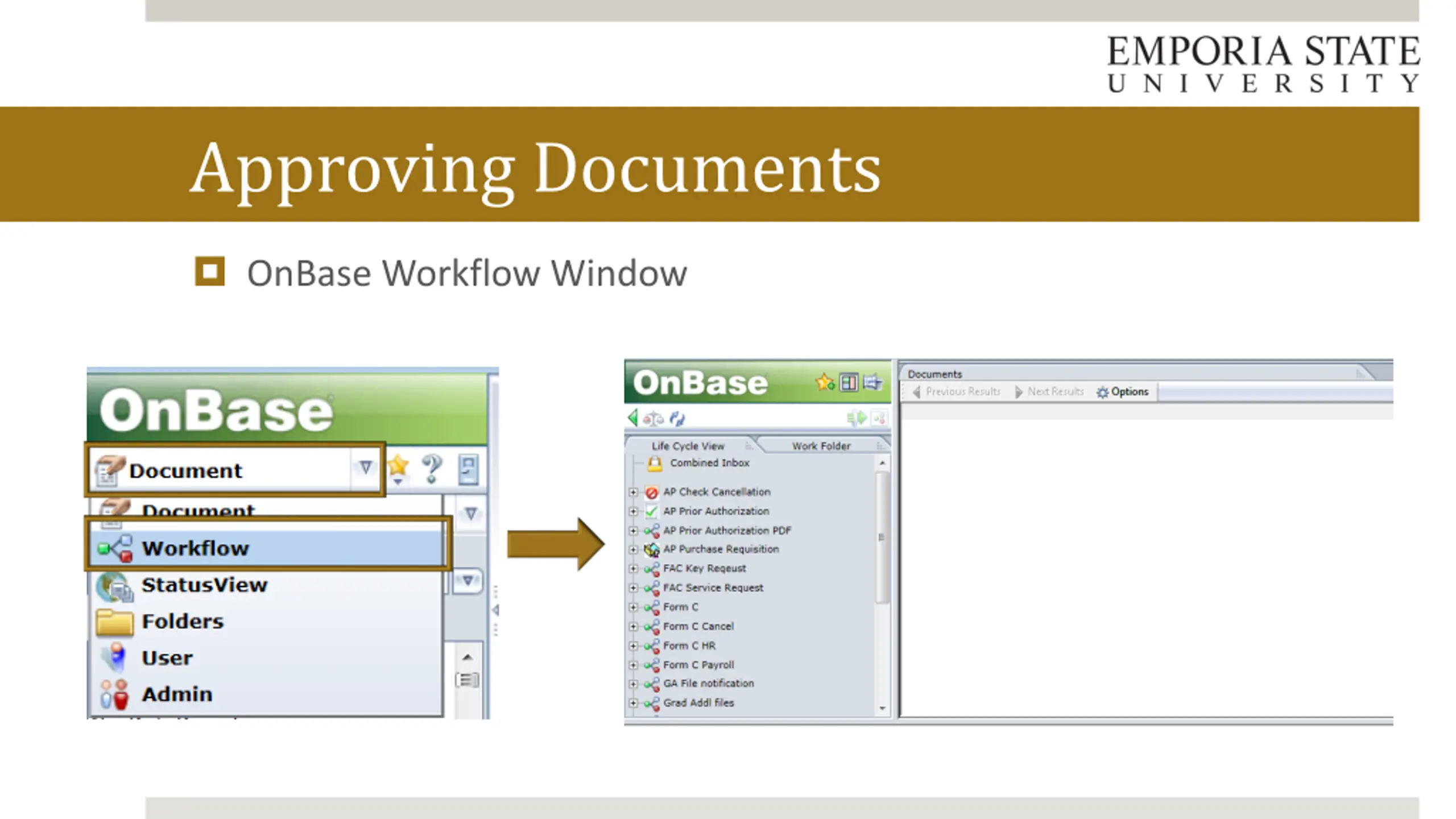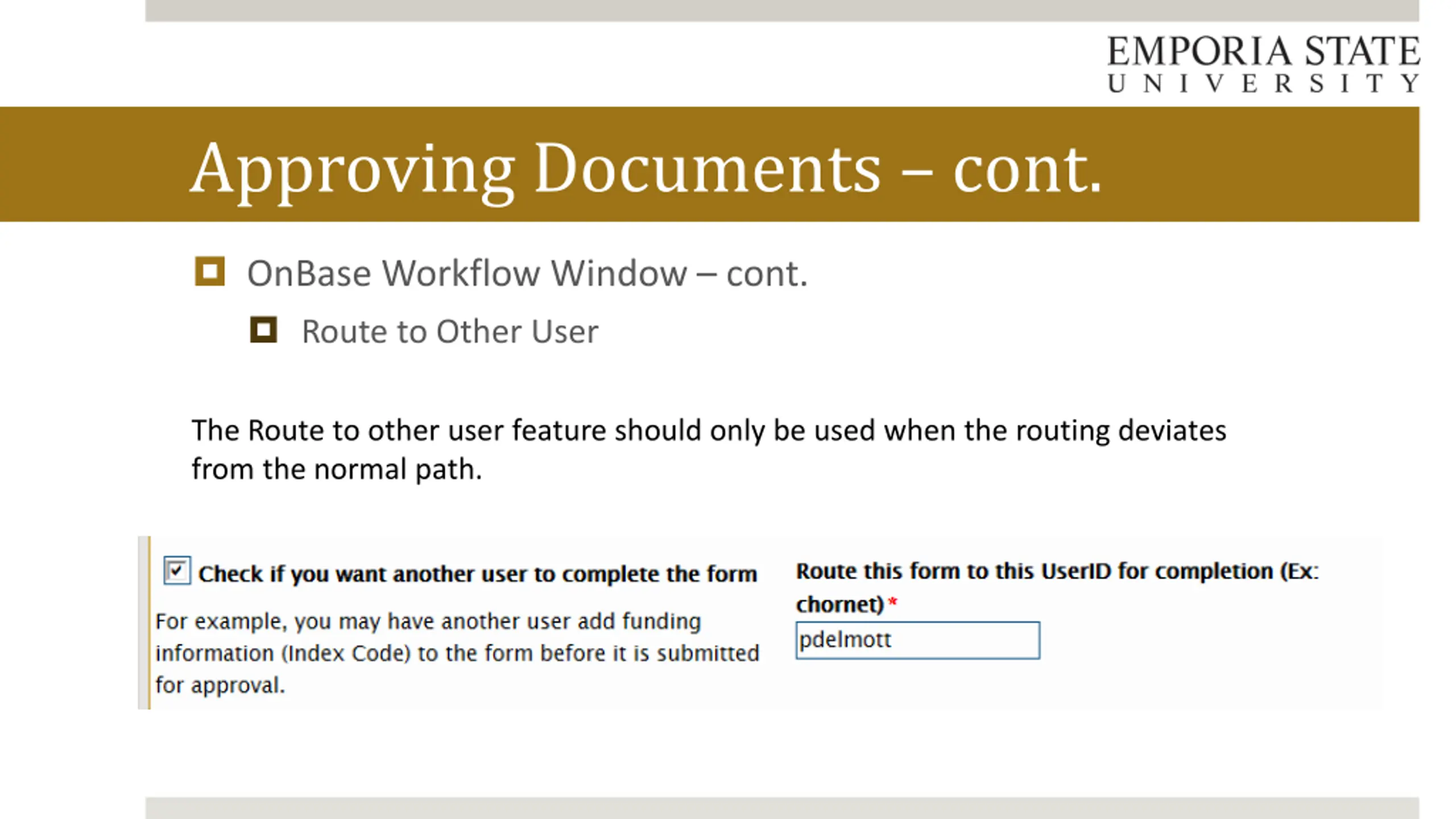 Approving Documents cont. OnBase Workflow Window cont. Route to Other User The Route to other user feature should only be used when the routing deviates from the normal path.