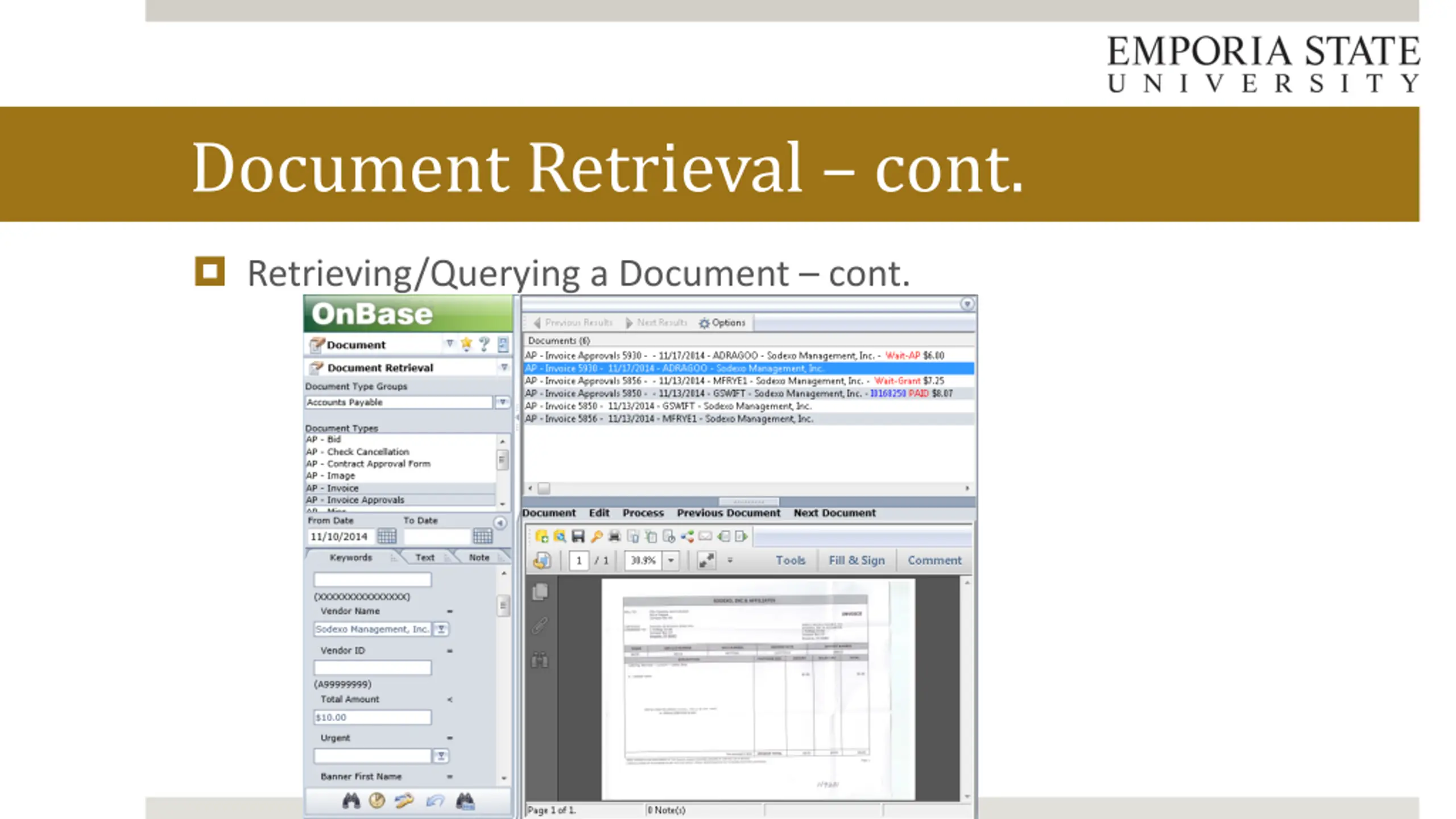 Document Retrieval cont. Retrieving/Querying a Document A) Document Type Group filters Document Types list B) Select Doc Types to search (hold Ctrl or Shift to select multiple) C) Provide a Document Date range D) Provide any keywords to help narrow the search (if necessary) E) Click the Search icon (binoculars) A) B) C) D) E)