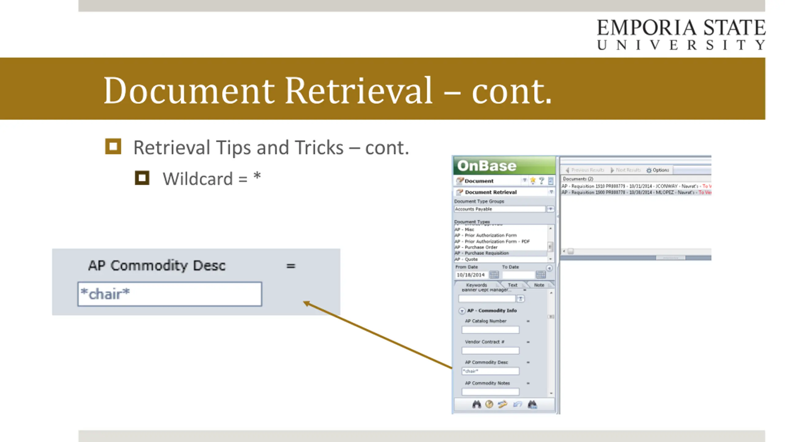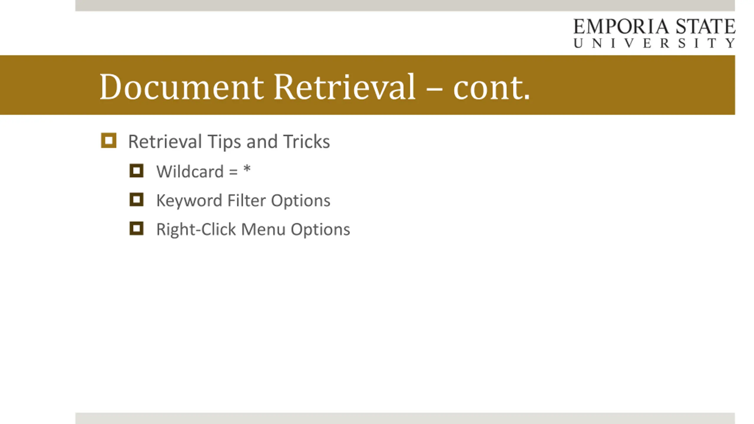 Document Retrieval cont. Retrieval Tips and Tricks Wildcard = * Keyword Filter Options Right-Click Menu Options