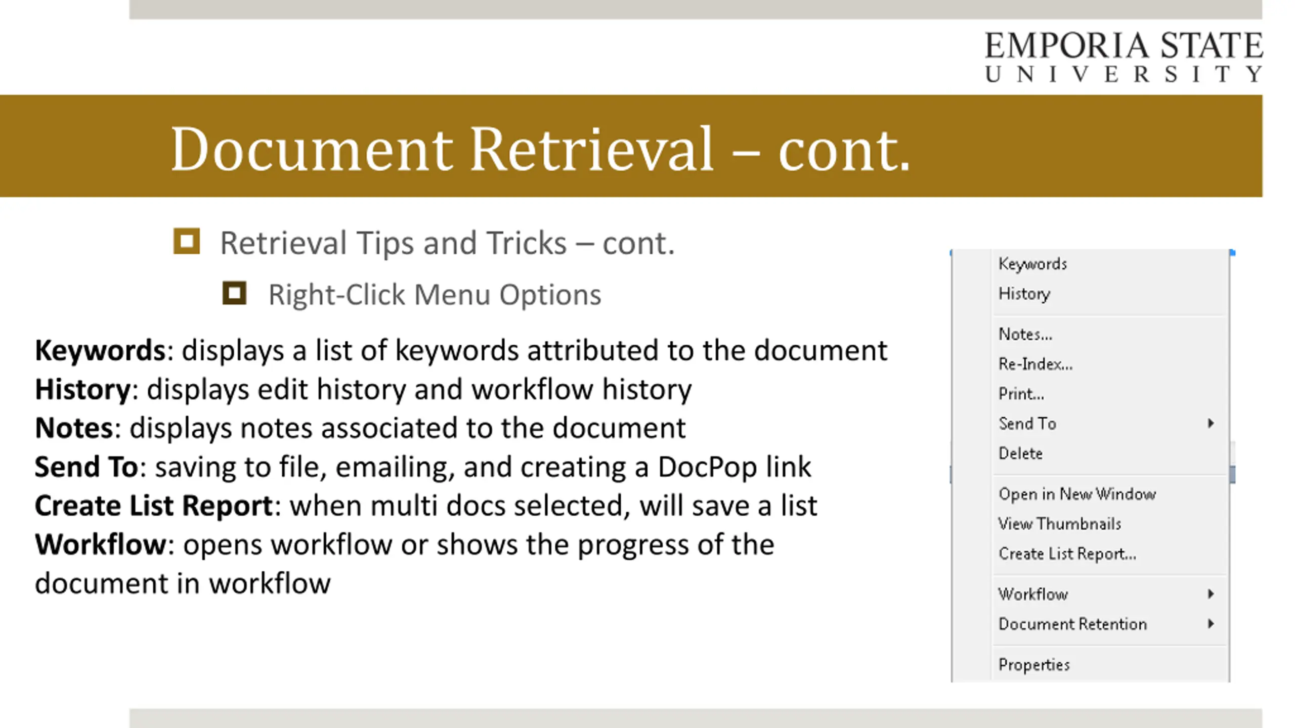 Document Retrieval cont. Retrieval Tips and Tricks cont. Right-Click Menu Options Keywords: displays a list of keywords attributed to the document History: displays edit history and workflow history Notes: displays notes associated to the document Send To: saving to file, emailing, and creating a DocPop link Create List Report: when multi docs selected, will save a list Workflow: opens workflow or shows the progress of the document in workflow
