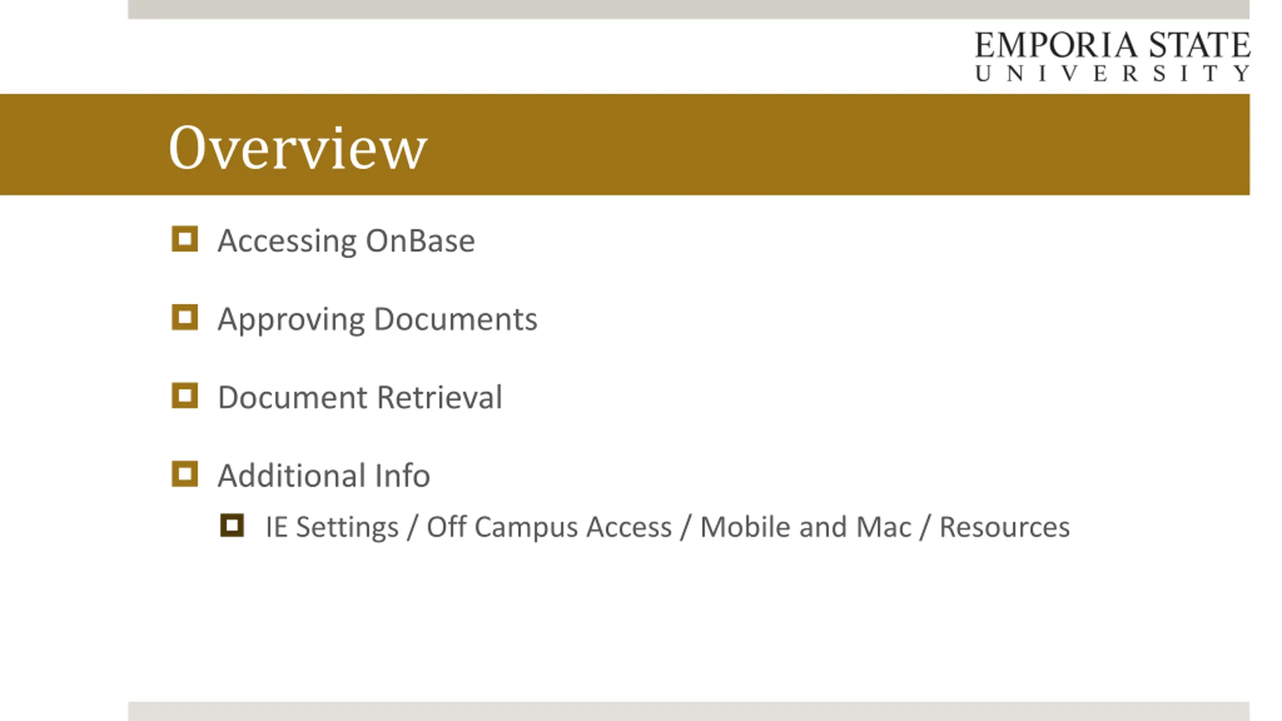 Overview Accessing OnBase Approving Documents Document Retrieval Additional Info IE Settings / Off Campus Access / Mobile and Mac / Resources